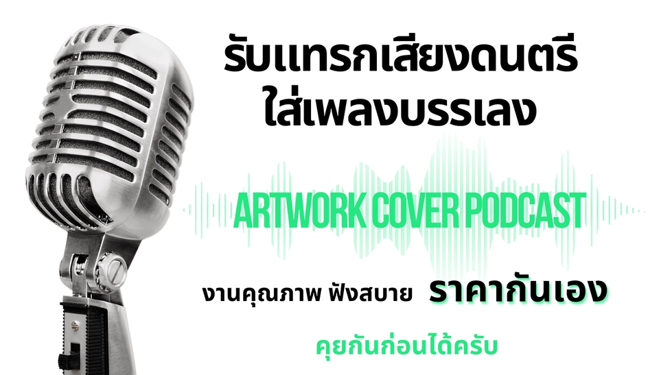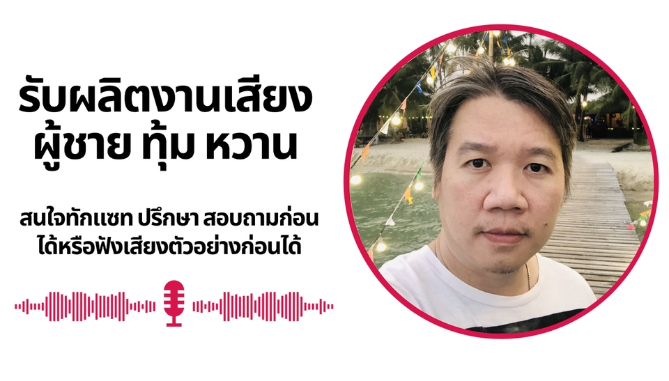 ▶︎ งานอ่านหนังสือเสียง บทความ ข่าว หนังสือสวดมนต์ ◀︎ - อ่านไม่เกิน 70 หน้า ราคาเหมา 700 บาท ไม่มีเสียงดนตรีประกอบ - อ่านไม่เกิน 70 หน้า ราคาเหมา 900 บาท มีเสียงดนตรีประกอบ - อ่านเกิน 70 หน้า ไม่มีเสียงดนตรีประกอบ เพิ่ม 20 บาท/ หน้า - อ่านเกิน 70 หน้า มีเสียงดนตรีประกอบ เพิ่ม 30 บาท/ หน้า - A5 - ระยะเวลาในการทำงาน สร็จภายใน 10-15 วัน - ลูกค้าจะได้รับไฟล์เสียง MP3 - ไฟล์เสียงไม่อนุญาตให้นำไปใช้ในเชิงพาณิชย์ ▶︎ งานอ่านนิยาย ◀︎ - อ่านไม่เกิน 50 หน้า ราคาเหมา 1000 บาท - อ่านไม่เกิน 51-100 ราคาเหมา 2800 บาท - หน้า 101-150 ราคาเหมา 4000 บาท - หน้า 151-200หน้า ราคาเหมา 5000 บาท - อ่านมากกว่า 200 หน้าขึ้นไป. คิดเพิ่ม 50 บาท/หน้า - A5 - ระยะเวลาในการทำงาน สร็จภายใน 10-15 วัน - ลูกค้าจะได้รับไฟล์เสียง MP3 - ไฟล์เสียงไม่อนุญาตให้นำไปใช้ในเชิงพาณิชย์ ขั้นตอนการทำงาน 1. แจ้งรายละเอียดงานและราคา 2. เลือกรูปแบบงานที่ต้องการ สิ่งที่ต้องการให้ทำ และกำหนดเวลาส่ง