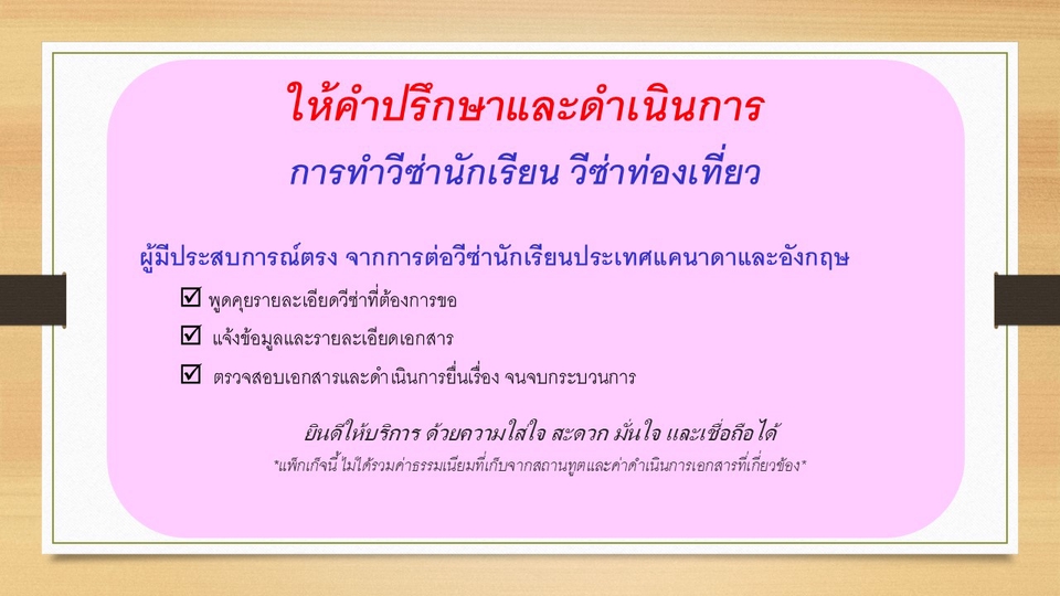 รับให้คำปรึกษาและดำเนินการ : 1. การทำวีซ่านักเรียน ตอบคำถามและข้อสงสัยของนักเรียน จากประสบการณ์เรียนและทำงานโดยตรง มานานกว่า 10 ปี ของประเทศแคนาดา และอังกฤษ 2. การทำวีซ่านักท่องเที่ยวประเทศอังกฤษ สหรัฐเอมริกา และ Schengen กระบวนการทำงาน ประกอบด้วย: - ดำเนินการทำวีซ่านักเรียน และนักท่องเที่ยว ตลอดกระบวนการ - ให้ข้อมูล เช็คและแจ้งเอกสารที่ต้องใช้ดำเนินการยื่นเรื่อง จนผ่าน **ค่าบริการ ไม่ได้รวมค่าใช้จ่ายที่ทางสถานทูตเรียกเก็บหรือค่าใช้จ่ายอื่นที่ใช้ดำเนินการ ในแพ็กเก็จนี้ค่ะ** ขั้นตอนการทำงาน 1. ลูกค้าแจ้งวัตถุประสงค์ เช่น ทำวีซ่านักเรียน ทำวีซ่าท่องเที่ยว และระบุประเทศ 2. ให้ข้อมูลเอกสารที่ต้องเตรียม ภายใน 1 วันทำการ 3. รวบรวมเอกสาร ดำเนินการยื่นเรื่อง และติดตามผลวีซ่า จนจบกระบวนการ