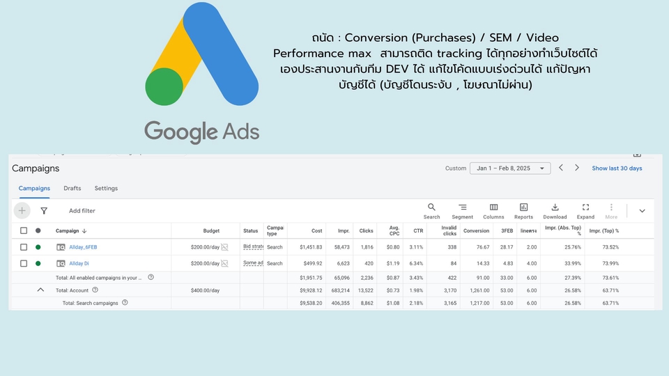 ให้การดูแล ช่องทางการขายต่างๆของคุณโดยมืออาชีพที่มีประสบการณ์ในการทำงานมาแล้วหลากหลาย category ของธุรกิจ ไม่ว่าจะเป็น อาหารเสริม , อาหาร , อุปกรณ์ IT , คอร์สเรียนออนไลน์ , อสังหาริมทรัพย์ , ยาสีฟัน , อุปกรณ์ความสวยความงาม , สินค้าแม่และเด็ก , ร้านอาหาร , คลินิคความงาม , คลินิคทันตกรรม , เครื่องเพชร , เครื่องประดับ , Web hosting , สตูพิลาทิส , ร้านซ่อมโทรศัพท์มือถือ , เครื่องดื่มกัญชา (ในเซเว่น) , เบเกอร์รี่ , ร้านทำผม , เครื่องมือ AI , หุ้น โดยลูกค้าสามารบอกความต้องการได้เลย เช่น อยากได้การรับรู้ของแบรนด์ , อยากเพิ่มยอดผู้ติดตาม , อยากสร้างยอดขาย , อยากเพิ่มกำไร ฯลฯ โดยทางเราจะทำการดูแลให้คุณตามความเหมาะสม แนะนำตามความเป็นจริงโดยมี option ให้เลือกเสมอ สามารถรีเควส Budget ได้ทั้งหมด มีมากมีน้อยสามารถทำได้ค่ะ ให้บริการโดย Ads opt มืออาชีพที่ทำมามากกว่า 13 ปีทั้งเงินตัวเองและเงินจากบริษัท ไม่เคยหยุดเรียนรู้พัฒนาตามเทรนด์ตลอด เป็นนักการตลาดที่ชอบการเห็นคนอื่นได้เสียเงินซื้ออะไรซักอย่างที่ตัวเองเป็นคนขายได้ ต่อให้ไม่ได้ค่าคอม หรือ ค่าตอบแทนใดๆ แต่การเห็นคนเสียเงินได้เพราะเรามันช่างมีความสุขข ขั้นตอนการทำงาน 1. รับบรีฟ 2. กำหนด Budget ที่จะใช้ 3. ขึ้น Ads 4. ดูแลประสิทธิภาพ 30 วัน 5. report 1 ครั้งหลังจาก 30 วัน