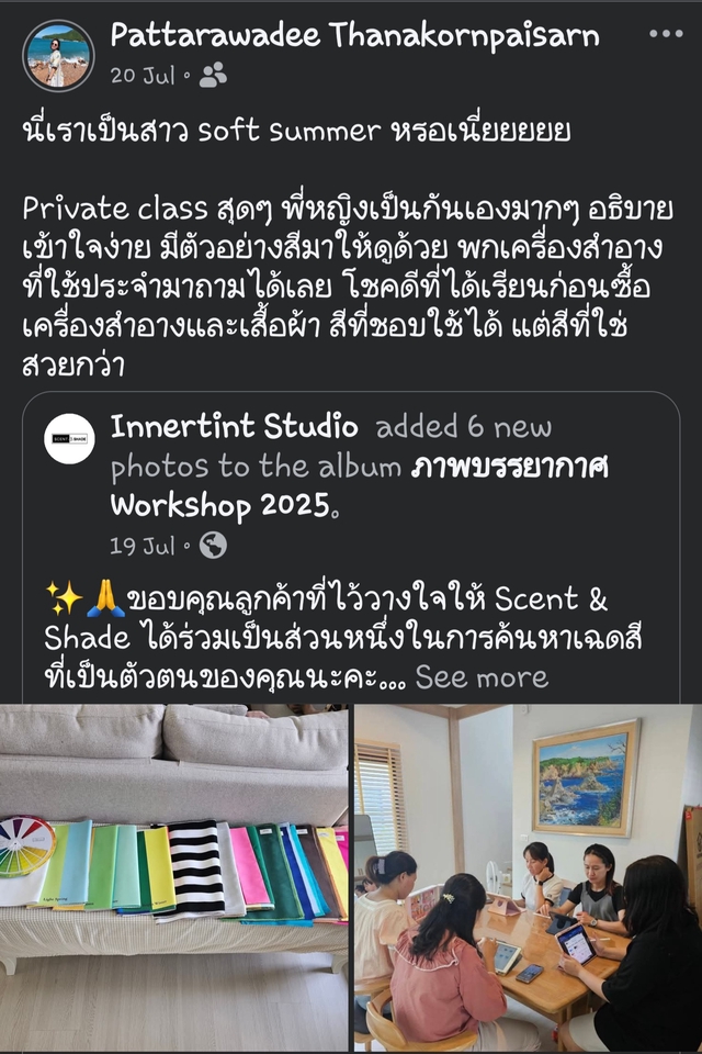 “Scent & Shade – Personal Color & Personal Scent Home Service” ✨ ค้นหาสีที่ใช่ & กลิ่นที่ชอบ…โดยไม่ต้องออกจากบ้าน 🏡 สตูดิโอวิเคราะห์สีและกลิ่นส่วนตัว ส่งตรงถึงบ้านคุณ 🌈 Personal Color | 🕯️ Personal Scent | 📍 ปทุมธานี กรุงเทพฯ และพื้นที่ใกล้เคียง ขั้นตอนการทำงาน 1. ทักแชทเพื่อนัดหมายวันเวลา 2. ลูกค้าทำการชำระเงิน เพื่อจองคิว 3. วิเคราะห์ Persernal Color และรับ Color Palette Card กลับบ้าน