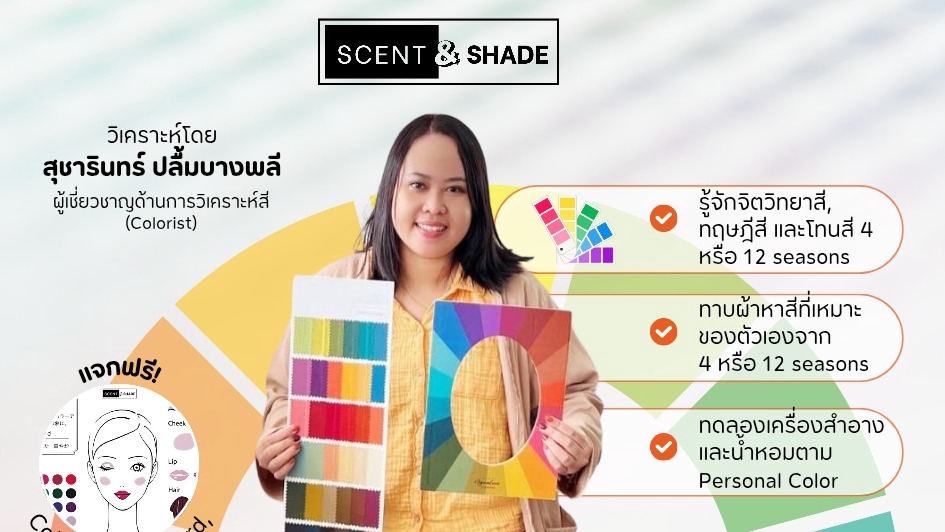 🎨 บริการวิเคราะห์ Personal Color (4 หรือ12 seasons) โดยผู้เชี่ยวชาญที่มีใบ Certificate รับรอง พร้อมทดลองน้ำหอมกลิ่นเอกลักษณ์เฉพาะ 4 seasons ✅️ วิเคราะห์ Personal Color พร้อมแนะนำสีเสื้อผ้า และเมคอัพ ✅️ ทดลองเมคอัพ และน้ำหอมตามฤดูกาล ลิขสิทธิ์เฉพาะที่ Scent & Shade เท่านั้น ✅️ รับฟรี!! Color Palette Card และ Digital File สำหรับใช้เลือกสีเสื้อผ้า เมคอัพ รวมถึงสีผม ✅️ สามารถเลือกใช้บริการได้ทั้งแบบ Home Service (บริการถึงบ้านลูกค้า), Cafe Service* (กรุงเทพและปริมณฑล) หรือที่ Scent & Shade Studio หมู่บ้านเวนิว โฟลว์ ติวานนท์ - รังสิต จ.ปทุมธานี ⌛️ ระยะเวลากิจกรรม: 2-3 ชั่วโมง *สถานที่: The Bridge 1958 สายไหม หรือ สถานที่ตามตกลง