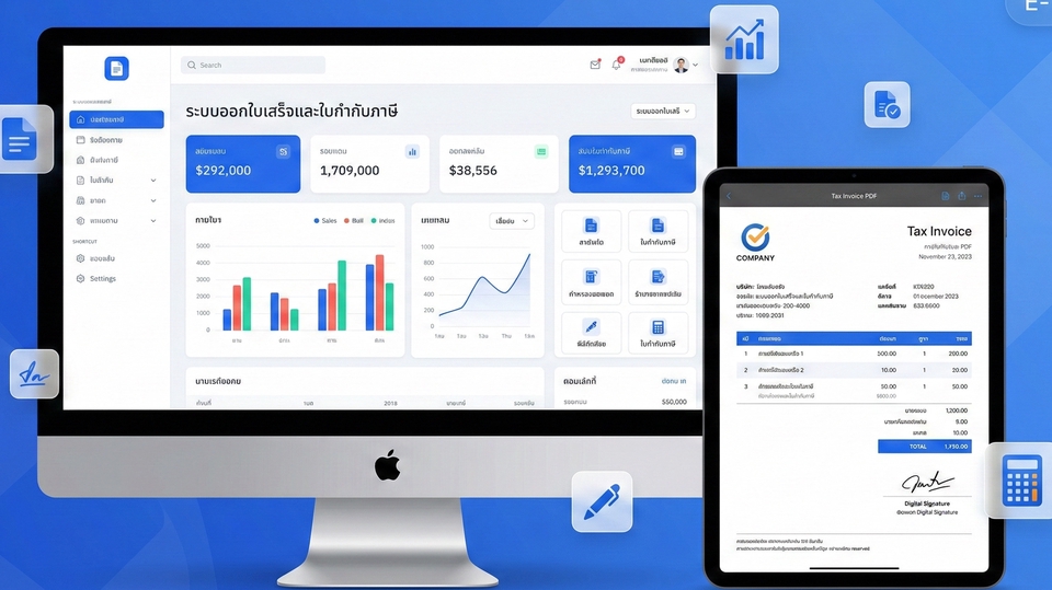 🧾 ระบบออกใบเสร็จและใบกำกับภาษี (Invoicing System) — พร้อมใช้งานทันที ระบบบริหารจัดการใบเสร็จ/ใบกำกับภาษีครบวงจร พัฒนาด้วย PHP + MySQL รองรับภาษาไทย 100% ออกแบบ UI/UX สวยงาม ทันสมัย รองรับทุกอุปกรณ์ (Desktop, Tablet, iPad, มือถือ)? ════════════════════════════ ✅ ฟีเจอร์หลัก ════════════════════════════ 📄 ออกเอกสารได้ 6 ประเภท • ใบกำกับภาษี / ใบเสร็จรับเงิน (Tax Invoice / Receipt) • ใบแจ้งหนี้ (Invoice) • ใบเสนอราคา (Quotation) • ใบเพิ่มหนี้ / ใบลดหนี้ (Debit Note / Credit Note) 📊 แดชบอร์ดสรุปยอดขาย • กราฟยอดขายรายเดือน • สรุปรายได้ / ยอดค้างชำระ • จำนวนใบเสร็จ / ลูกค้าทั้งหมด • ปุ่มทางลัดเข้าถึงเมนูต่างๆ ได้รวดเร็ว 🧮 คำนวณภาษีอัตโนมัติ • VAT 7% (เปิด/ปิดได้) • หัก ณ ที่จ่าย 1% / 2% / 3% / 5% • ส่วนลดเปอร์เซ็นต์ • แปลงตัวเลขเป็นตัวอักษรภาษาไทย (บาทถ้วน) อัตโนมัติ ✍️ ลายเซ็นดิจิทัล (Digital Signature) • วาดลายเซ็นด้วยมือ (รองรับ iPad / Tablet / Stylus) • อัพโหลดไฟล์ภาพลายเซ็น • ลายเซ็นผู้ออกเอกสาร — ตั้งค่าครั้งเดียว ขึ้นทุกใบเสร็จอัตโนมัติ • ลายเซ็นผู้รับสินค้า/บริการ — ระบุเฉพาะแต่ละใบ 📑 PDF พร้อมพิมพ์ • สร้าง PDF ใบเสร็จสวยงาม พร้อมพิมพ์ทันที • แสดงลายเซ็นดิจิทัลอัตโนมัติ • แสดงโลโก้บริษัท / ข้อมูลผู้ออก-ผู้รับ ครบถ้วน 👥 จัดการข้อมูลพื้นฐาน • ลูกค้า — ชื่อ, ที่อยู่, เลขผู้เสียภาษี, สาขา • สินค้า/บริการ — ชื่อ, รหัส, ราคา, หน่วย, หมวดหมู่ • ข้อมูลบริษัท — โลโก้, ที่อยู่, บัญชีธนาคาร, ลายเซ็น 📈 รายงาน & ส่งออก • รายงานยอดขายรายเดือน • ส่งออก Excel สำหรับส่งบัญชี/สรรพากร • กรองตามช่วงวันที่ / ประเภทเอกสาร ════════════════════════════ 🛠 เทคโนโลยีที่ใช้ ════════════════════════════ • PHP 8+ / MySQL (ทำงานบน XAMPP, WAMP, หรือ Web Hosting ทั่วไป) • Bootstrap 5 — Responsive ทุกอุปกรณ์ • Chart.js — กราฟสวยงาม • HTML5 Canvas — ลายเซ็นดิจิทัล • Google Fonts (Sarabun) — ฟอนต์ไทยคมชัด ════════════════════════════ 📦 สิ่งที่จะได้รับ ════════════════════════════ ✅ Source Code ทั้งหมด (ไม่เข้ารหัส ปรับแต่งได้ 100%) ✅ ฐานข้อมูล SQL พร้อมข้อมูลตัวอย่าง ✅ คู่มือติดตั้ง + คู่มือใช้งาน ✅ รองรับ Desktop / Tablet / iPad / มือถือ ✅ ทดสอบผ่านระบบอัตโนมัติ 49 รายการ 100% ✅ อัพเดตฟรี + ซัพพอร์ตหลังซื้อ ════════════════════════════ 💡 เหมาะสำหรับ ════════════════════════════ • ธุรกิจ SME / ร้านค้า / ฟรีแลนซ์ • สำนักงานบัญชี • ธุรกิจบริการ / ที่ปรึกษา • ต้องการระบบออกบิลเป็นของตัวเอง ไม่ต้องจ่ายรายเดือน • นักพัฒนาที่ต้องการ source code ไปต่อยอด ⚠️ หมายเหตุ: ระบบนี้เป็น "ระบบออกใบเสร็จ/ใบกำกับภาษี" ทั่วไป ไม่ใช่ระบบ e-Tax Invoice ที่ต้องลงทะเบียนกับกรมสรรพากร สามารถใช้งานได้ถูกต้องตามกฎหมายสำหรับการออกเอกสารทางการค้าทั่วไป