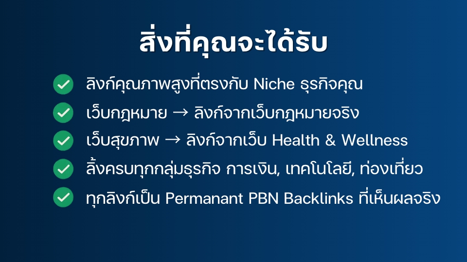 ทำไมคุณถึงต้องใช้ลิงค์ผม ? > ผมเคยพลาดมาก่อน ซื้อลิงก์ 5,000 ลิงก์ใน Fastwork เสีย 35,000 บาท ลิงก์ที่ได้กลับมาเป็นสแปม เว็บไม่ขึ้น แถมเสี่ยงโดนแบนยับเยิน ผมติดต่อกับเจ้าขจองเว็บใหญ่ทั่วโลกรู้ว่าอะไร work ไม่ work กับเว็บคุณ หลายเจ้าขายลิงก์ที่ DA/DR สูง "ปลอม" แต่เว็บไม่มี Traffic เลย > ปัจจุบันเว็บไซต์ผมมีผู้ใช้งานจริงมากกว่า 3 ล้านคนต่อปี ผมจ่ายให้ Agency เดือนละแสน เพื่อ Backlink สุดท้ายแล้วสิ่งที่ดีที่สุดคือ PBN Backlink ลิงก์พวกนี้มาจากไหน? ทำไมผมมั่นใจว่าผมเร่งอันดับให้เว็บคุณได้ ? > มาจากเจ้าของเว็บตัวจริงเสียงจริงทั่วโลก! แต่ละเว็บมีการลงทุนทำ SEO อย่างหนัก เพื่อปั้นเว็บตัวเองขึ้นมา และเปิดโอกาสให้ "แชร์พลังลิงก์" กับคนที่เข้าใจคุณค่าเท่านั้น > ไม่ว่าคุณทำเว็บสายไหน ผมมีลิงก์ที่ตรง Niche ให้คุณเสมอ เพราะ "ความสอดคล้องของเนื้อหา (Topical Relevance)" คือหัวใจสำคัญของการทำ SEO Google ให้ "น้ำหนัก" พิเศษกับลิงก์ที่มาจากเว็บที่เนื้อหาเกี่ยวข้องกัน → นี่คือเคล็ดลับที่ทำให้ลิงก์ผม "โคตรทรงพลัง"! เว็บกฎหมาย = ผมจัดลิงก์จากเว็บกฎหมายให้ เว็บสุขภาพ = ผมจัดลิงก์จากเว็บ Health & Wellness ให้ เว็บการเงิน, เว็บท่องเที่ยว, เว็บเทคโนโลยี ฯลฯ = ครบทุกกลุ่ม ขั้นตอนการทำงาน 1. แนะนำว่าบอกมาเลยว่าอยากได้ ติดคำไหน และ URL ไหน 2. วิเคราะห์กลยุทธ์ที่ลูกค้าวางแผนก่อนว่าจะ work ไหม 3. คำแนะนำตามตรง 4. ดำเนินการให้เสร็จ