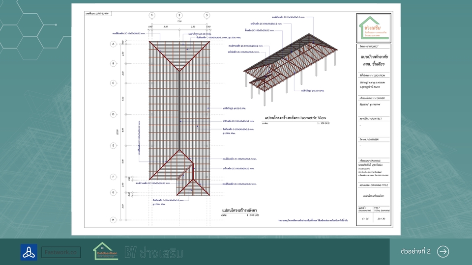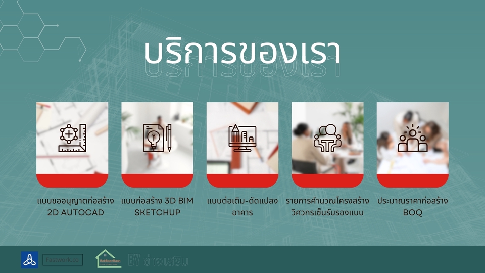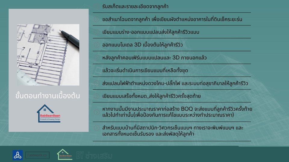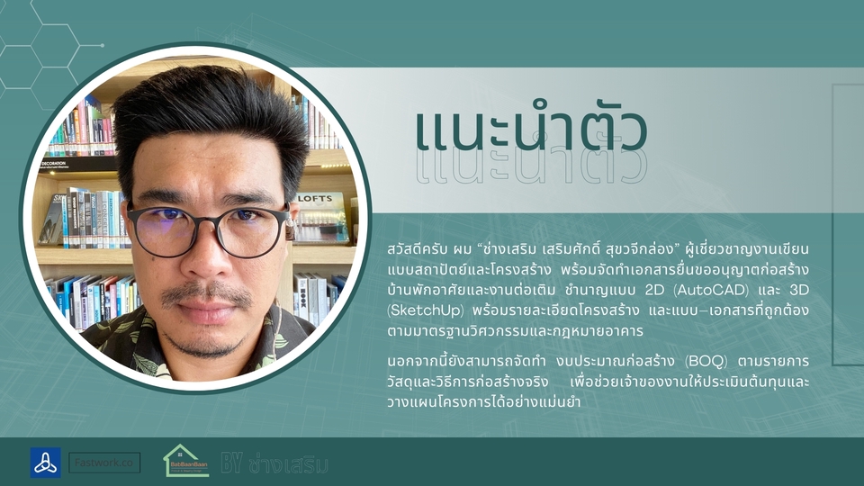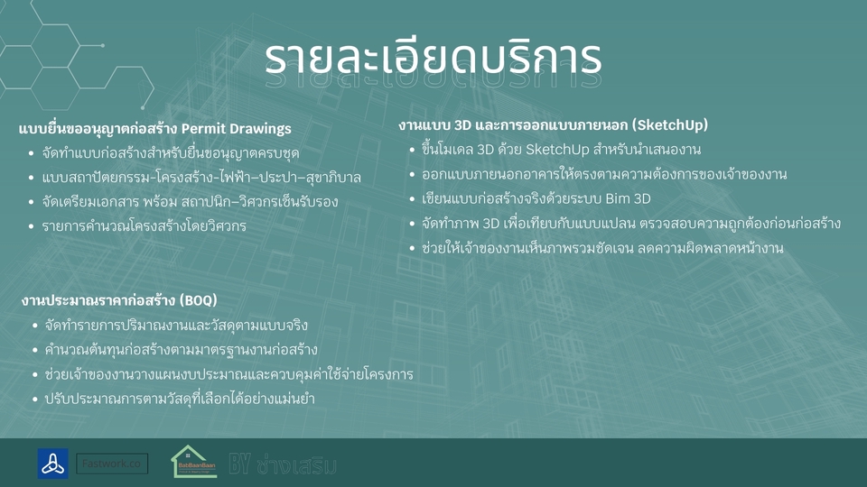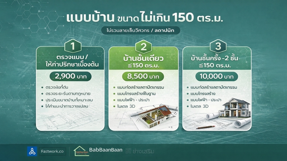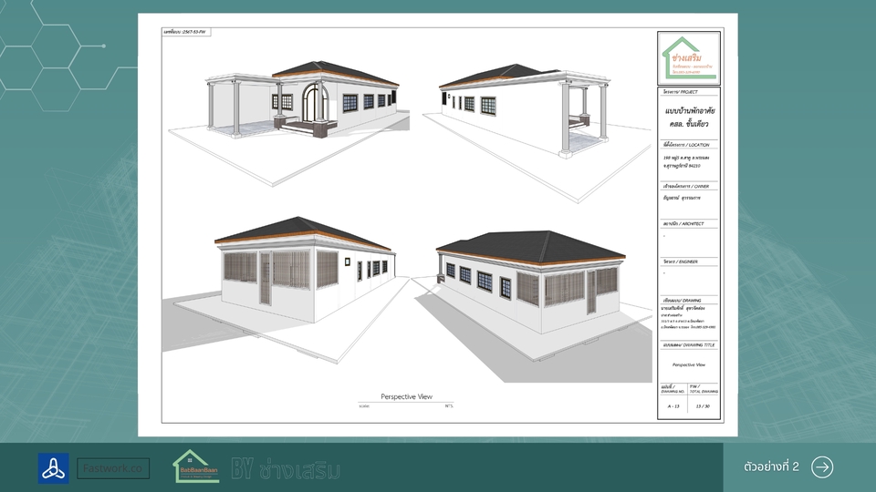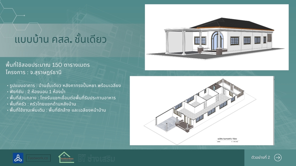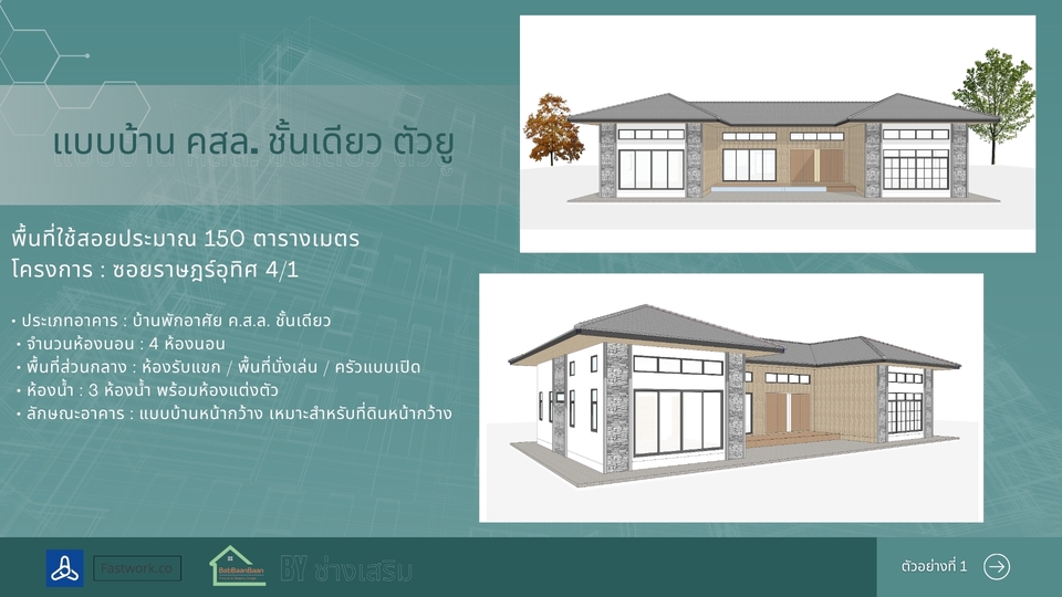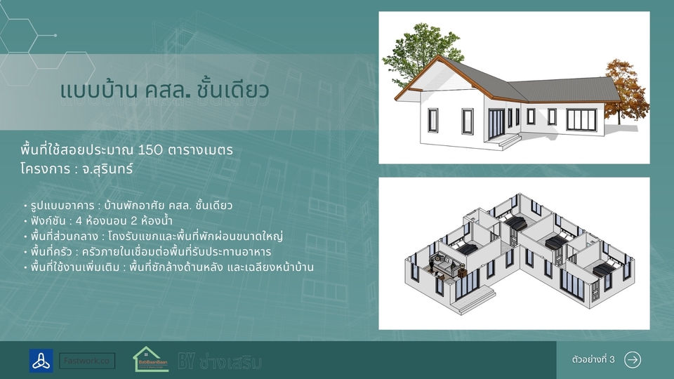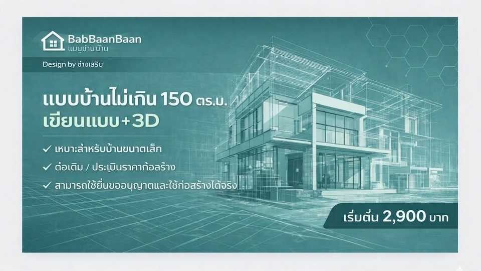 รายละเอียดงาน รับออกแบบและเขียนแบบบ้านพักอาศัย พร้อมภาพ 3D สำหรับใช้วางแผนก่อสร้าง เหมาะสำหรับบ้านขนาดเล็ก บ้านชั้นเดียว บ้านสองชั้น หรือการต่อเติมบ้าน สามารถจัดทำแบบจาก สเก็ตช์ แนวคิด หรือความต้องการของลูกค้า พร้อมขึ้นโมเดล 3D (SketchUp) เพื่อให้เห็นรูปทรงอาคารก่อนก่อสร้างจริง บริการประกอบด้วย • ออกแบบแปลนพื้นบ้าน (Floor Plan) • จัดทำรูปด้านอาคาร (Elevation) • ภาพโมเดล 3D เพื่อดูรูปทรงบ้าน • จัดส่งไฟล์แบบ PDF สำหรับใช้งาน เหมาะสำหรับ • บ้านพักอาศัยขนาดไม่เกิน 150 ตร.ม. • บ้านชั้นเดียวหรือสองชั้นขนาดเล็ก • งานต่อเติมหรือปรับปรุงบ้าน • ใช้สำหรับประเมินราคาก่อสร้างกับผู้รับเหมา ราคาเริ่มต้น 2,900 บาท ราคาขึ้นอยู่กับขนาดพื้นที่ใช้สอยและรายละเอียดของแบบ สำหรับบ้านที่ต้องใช้แบบ ยื่นขออนุญาตก่อสร้าง สามารถจัดทำแบบก่อสร้างครบชุด พร้อมสถาปนิกและวิศวกรเซ็นรับรองแบบได้ (คิดค่าบริการเพิ่มเติมตามขนาดโครงการ) ประสบการณ์และความเชี่ยวชาญ • มีประสบการณ์ด้านการออกแบบและเขียนแบบบ้านพักอาศัย • ใช้งานโปรแกรม SketchUp และ Layout ในการจัดทำแบบก่อสร้าง • มีความเข้าใจงานก่อสร้างจริง สามารถออกแบบให้เหมาะกับการก่อสร้างและงบประมาณ • สามารถจัดทำแบบเพื่อใช้ยื่นขออนุญาตก่อสร้างกับหน่วยงานราชการได้ ขั้นตอนการทำงาน 1.ลูกค้าส่งรายละเอียดความต้องการ หรือสเก็ตช์แบบเบื้องต้น 2.จัดทำแบบแปลนพื้นและส่งให้ลูกค้าตรวจสอบ 3.จัดทำรูปด้านและภาพ 3D ของบ้าน 4.ลูกค้าตรวจสอบและแจ้งแก้ไขเพิ่มเติม 5.ส่งไฟล์แบบ PDF ให้ลูกค้านำไปใช้งาน สิ่งที่ต้องการจากลูกค้า • ขนาดที่ดินหรือขนาดพื้นที่ต้องการสร้างบ้าน • จำนวนห้อง เช่น ห้องนอน ห้องน้ำ ห้องครัว • ตัวอย่างแบบบ้านหรือสไตล์ที่ต้องการ • สเก็ตช์หรือไอเดียเบื้องต้น (ถ้ามี) กรณีต้องการทำแบบเพื่อ ยื่นขออนุญาตก่อสร้าง อาจต้องใช้สำเนาโฉนดที่ดินเพื่อจัดทำผังอาคาร ข้อกำหนดและเงื่อนไข • ราคาขึ้นอยู่กับขนาดพื้นที่และรายละเอียดของแบบ • ลูกค้าสามารถปรับแก้แบบได้ตามความเหมาะสมในขั้นตอนออกแบบ • ไฟล์ที่ส่งมอบเป็นไฟล์ PDF สำหรับใช้งาน • งานยื่นขออนุญาตก่อสร้างและงานที่ต้องมีวิศวกรหรือสถาปนิกเซ็นแบบ จะมีค่าใช้จ่ายเพิ่มเติม