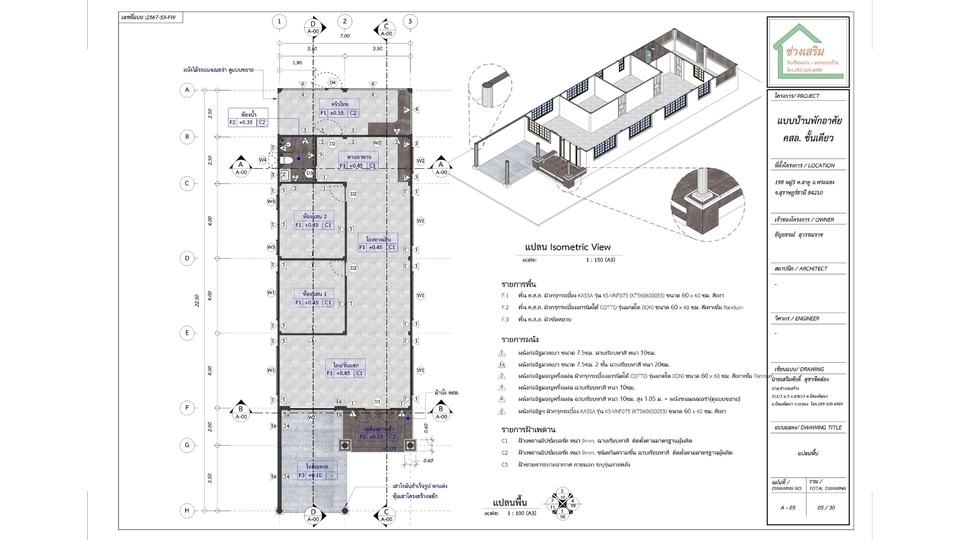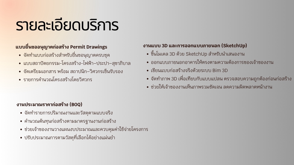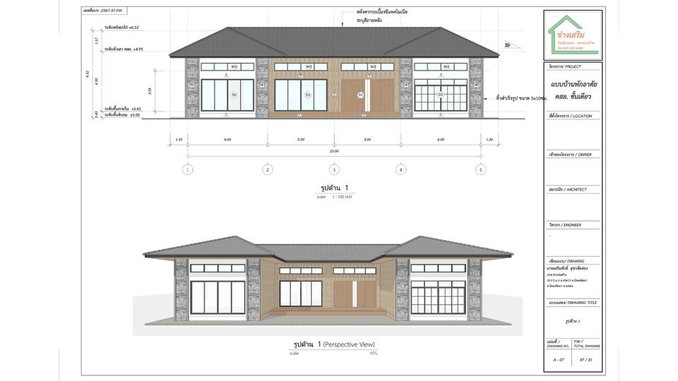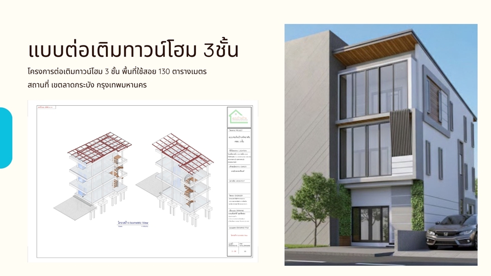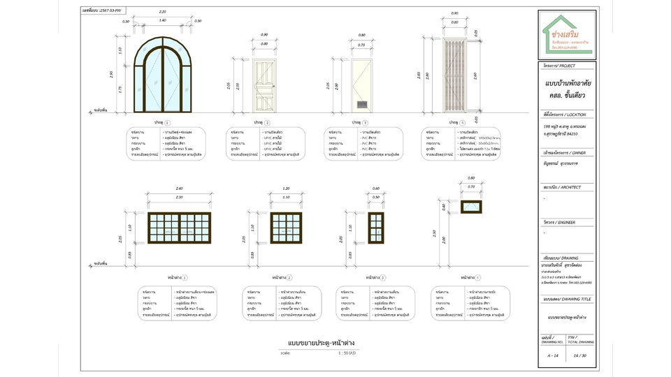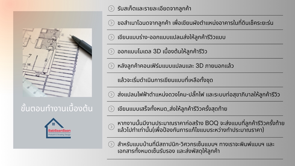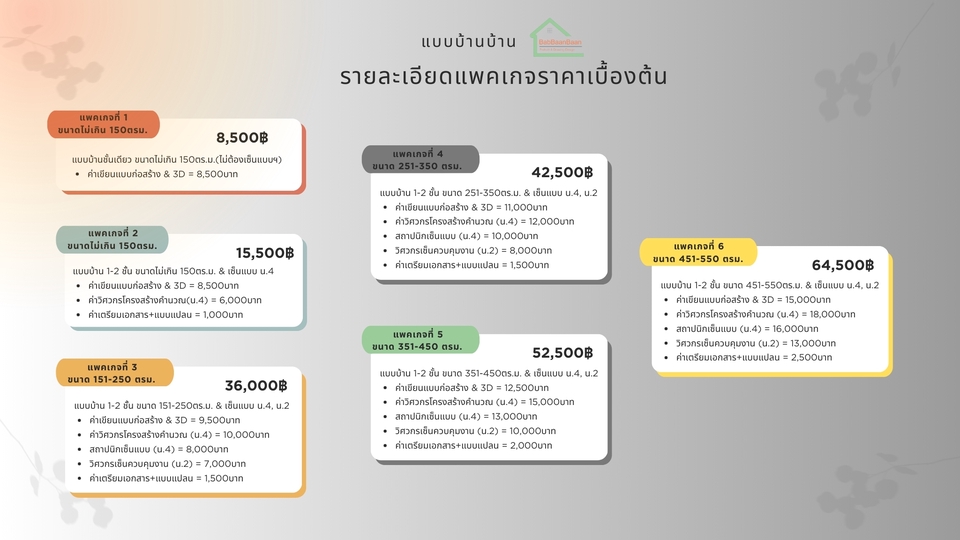 - รับเขียนแบบบ้านพักอาศัย, บ้านโครงการ, อาคารพาณิชย์,ทาวน์เฮ้าส์, เพื่อใช้งานก่อสร้าง และยื่นขออนุญาตก่อสร้างกับเทศบาล,อบต, สำนักงานเขต หรือทำเรื่องยื่นกู้สินเชื่อ แบบก่อสร้างครบชุดทั้งแบบสถาปัตยกรรม,โครงสร้าง,ไฟฟ้า,ประปา-สุขาภิบาล - มีสถาปนิก และวิศกรเซ็นรับรองแบบฯ สำหรับแบบบ้านที่เกิน 150ตร.ม.ขึ้นไป พร้อมทั้ง ทำรายงานคำนวณโครงสร้าง และเอกสารประกอบการยื่นขออนุญาตครบพร้อมยื่นฯ เอกสารส่งไฟล์ PDF ให้ในระบบ และปริ๊นท์ลงกระดาษพร้อมเซ็นรองแบบและเอกสารทั้งหมด หร้อมให้ลูกค้านำไปยื่นได้ทันที **รายละเอียดราคาตามขนาดพื้นที่ใช้สอย** 1.แบบบ้านชั้นเดียว,สองชั้น ขนาดไม่เกิน 150ตร.ม.(ไม่ต้องเซ็นแบบฯ) = 7,500บาท 2.แบบบ้านชั้นเดียว,สองชั้นขึ้นไป ขนาด 150-250 ตร.ม. - ค่าจ้างเขียนแบบก่อสร้าง = 9,000บาท - วิศวกรโครงสร้างคำนวณ+เซ็นแบบ (ภย.) = 10,000บาท - สถาปนิกเซ็นแบบ (สถ.) =7,500บาท - วิศวกรเซ็นควบคุมงานเพื่อขออนุญาต = (ภย.) 6,500บาท - ค่าเตรียมเอกสาร+แบบสำหรับยื่นขออนุญาต = 2,000บาท รวม 35,0000บาท ขั้นตอนการทำงาน 1. รับสเก็ตและรายละเอียดจากลูกค้า 2. ขอสำเนาโฉนดจากลูกค้า เพื่อเขียนผังตำแหน่งอาคารในที่ดินเช็คระยะร่น 3. เขียนแปลนส่งให้ลูกค้ารีวิวแบบ 4. เขียนรูปด้านส่งให้ลูกค้ารีวิวแบบ 5. หลังลูกค้าคอนเฟิร์มแบบแปลน+รูปด้านแล้วจะเริ่มดำเนินการเขียนแบบที่เหลือทั้งชุด 6. ส่งแปลนไฟฟ้าตำแหน่งดวงโคมและปลั๊กไฟ ให้ลูกค้ารีวิว 7. เขียนแบบเสร็จทั้งหมด_ส่งให้ลูกค้ารีวิวครั้งสุดท้าย 8. สำหรับแบบบ้านที่มีสถาปนิก-วิศวกรเซ็นแบบฯ ทางเราจะพิมพ์แบบฯ และเอกสารทั้งหมดเซ็นรับรอง และส่งพัสดุให้ลูกค้า หลังจากลูกค้าอนุมัติงานในระบบแล้ว