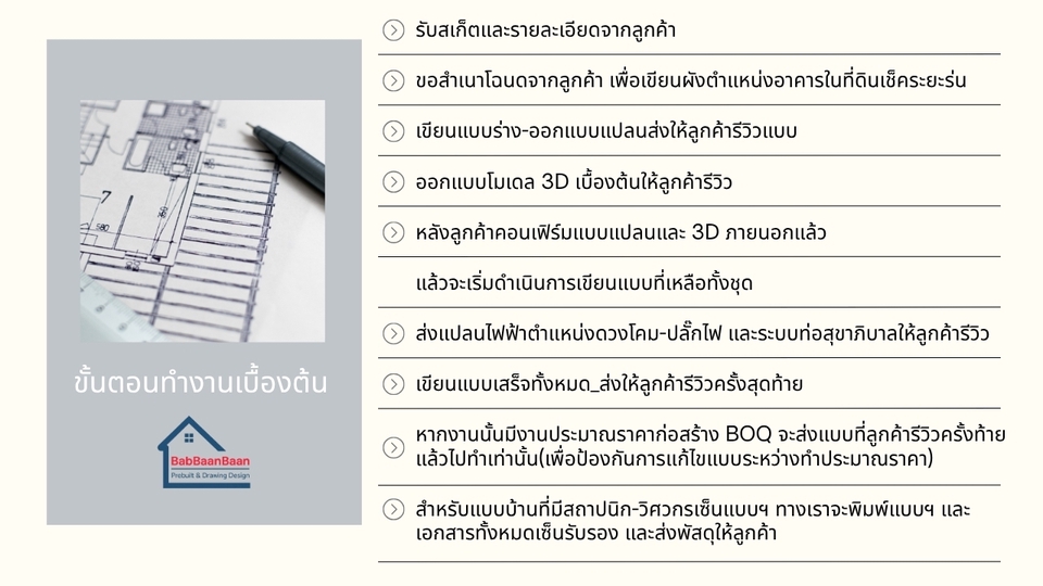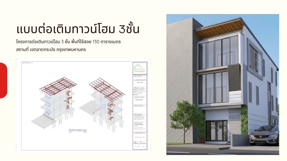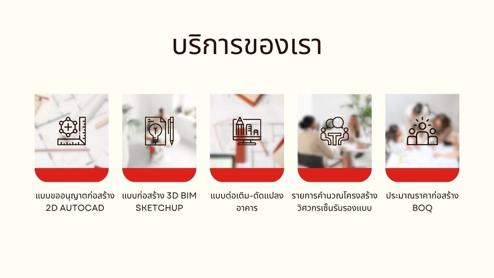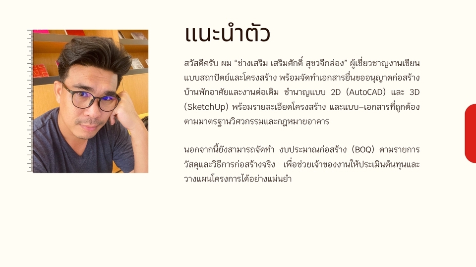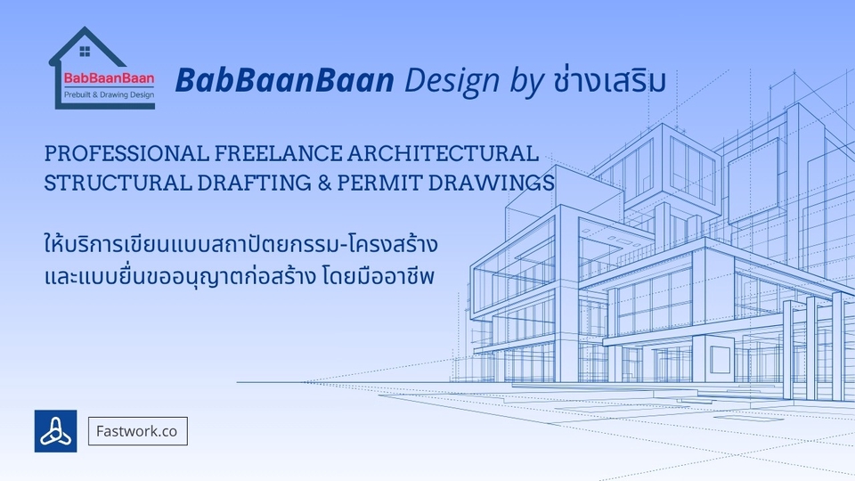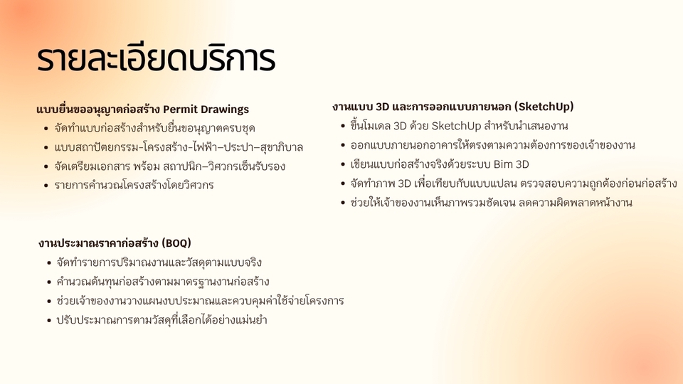 เราให้บริการเขียนแบบก่อสร้าง (พิมพ์เขียว 2D) ครบชุด จบในที่เดียว เพื่อใช้ในการก่อสร้างจริง, ยื่นขออนุญาตตามกฎหมาย, และยื่นกู้ธนาคาร จุดเด่นของบริการ: 1. ครบทุกระบบ (4 in 1): ได้แบบก่อสร้างครบถ้วนทั้ง งานสถาปัตยกรรม, งานโครงสร้าง, งานระบบไฟฟ้า (M&E), และ งานระบบสุขาภิบาล 2. เห็นภาพชัดเจนด้วย 3D: จัดทำ ไฟล์ 3D SketchUp เพื่อให้ลูกค้าเห็นภาพรวมของอาคารได้อย่างสมจริงก่อนเริ่มก่อสร้างจริง 3. พร้อมใช้งาน 100%: มีสถาปนิกและวิศวกร เซ็นรับรองแบบ พร้อมจัดทำรายงานคำนวณครบชุด เพื่อให้พี่เสริมนำไปยื่นขออนุญาต (เทศบาล/อบต.) ได้ทันที 4. ควบคุมงบประมาณ: จัดทำรายการประมาณราคา (BOQ) เพื่อช่วยควบคุมต้นทุนการก่อสร้าง 5. ยืดหยุ่นสูง: ลูกค้าสามารถเลือกจ้างงานเฉพาะหมวดได้ เช่น จ้างเฉพาะงานโครงสร้าง หรือ งานสถาปัตยกรรมเท่านั้น ________________________________________ 🛠️ ขั้นตอนการทำงาน (Work Process) - ฉบับเพิ่ม 3D SketchUp 1. รับข้อมูลเริ่มต้น: รับบรีฟ, สเก็ตแบบ, และสำเนาโฉนดที่ดินจากลูกค้า 2. รีวิวแบบร่างและ 3D (ขั้นตอนใหม่): เขียนแบบแปลนและจัดทำ 3D SketchUp เบื้องต้น ส่งให้ลูกค้า ตรวจสอบและยืนยัน รูปแบบ 3. เขียนแบบครบชุด: ดำเนินการเขียนแบบโครงสร้างและงานระบบทั้งหมดในรูปแบบ 2D 4. ส่งแบบฉบับสมบูรณ์: ส่งแบบก่อสร้าง 2D และ ไฟล์ 3D SketchUp ฉบับสมบูรณ์ ให้ลูกค้า อนุมัติครั้งสุดท้าย 5. ส่งมอบและรับรอง: ดำเนินการจัดทำ BOQ และการเซ็นรับรองแบบ หลังจากลูกค้าอนุมัติแบบเรียบร้อยแล้ว