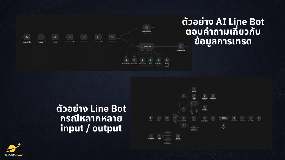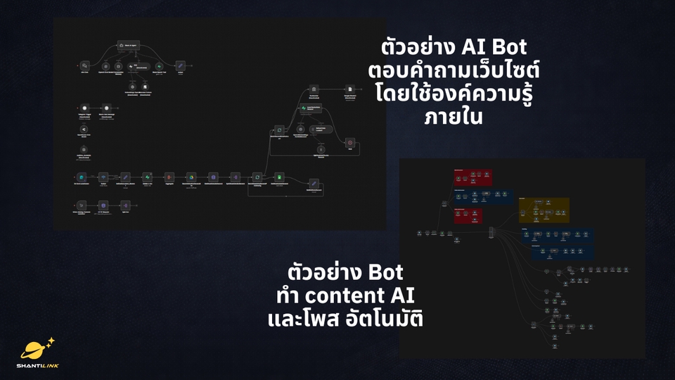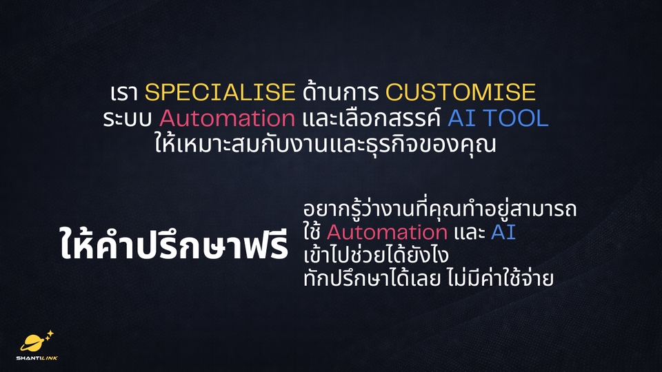 ## ShantiLink ช่วยให้ธุรกิจของคุณทำงานเร็วขึ้นด้วยระบบอัตโนมัติและ AI เราเข้าใจดีว่าเจ้าของธุรกิจและทีมเล็ก ๆ ในยุคนี้ต้องทำหลายอย่างพร้อมกัน เป้าหมายของเราคือช่วยคุณ “ลดเวลาทำงานซ้ำ ๆ” และ “เพิ่มเวลาให้กับสิ่งที่สำคัญจริง ๆ” เราวางระบบอัตโนมัติให้ทำงานแทนคนได้อย่างยืดหยุ่น ไม่ต้องพึ่งระบบสำเร็จรูปที่คิดเงินเพิ่มตามจำนวนผู้ใช้ เพราะคุณสามารถ **โฮสต์ระบบของตัวเองได้** ด้วย n8n ใช้ได้ไม่จำกัดและควบคุมเองได้เต็มที่ --- ### บริการของเรา **n8n Automation Setup & Hosting:** ติดตั้งและตั้งค่า n8n พร้อมใช้งานบนเซิร์ฟเวอร์ของคุณเอง หรือบน Cloud ที่เลือกได้ **AI Learning & Training:** สอนการใช้งาน AI และระบบอัตโนมัติจากโปรเจกต์จริง เหมาะสำหรับเจ้าของธุรกิจหรือทีมที่อยากเข้าใจระบบของตัวเอง ** AI Coding Assistant** สอนการเขียน Web application โดยใช้ AI Coding tool ตามความเหมาะสมของงาน เช่น Lovable, V0, Cursor, Winsurf, Google Antigravity และ AI CODING TOOL อื่นๆ --- ### สิ่งที่คุณจะได้จากเรา - 🕒 **ประหยัดเวลา:** ให้ระบบทำงานซ้ำแทนคุณ - ⚙️ **เพิ่มประสิทธิภาพ:** ใช้ AI ช่วยตรวจสอบ วิเคราะห์ และตัดสินใจ - 💰 **คุ้มค่ากว่า:** โซลูชันที่ขยายต่อได้เอง ไม่ต้องจ่ายเพิ่มตามผู้ใช้ --- ### เหมาะสำหรับ - **เจ้าของธุรกิจ** ที่อยากให้ระบบทำงานแทนทีม - **นักพัฒนา / ฟรีแลนซ์ / ทีมเทคฯ** ที่อยากสร้างระบบอัตโนมัติแบบควบคุมได้เอง --- ### ขั้นตอนการทำงาน 1. นัดปรึกษาฟรีเพื่อดูว่าเราช่วยคุณได้ตรงไหน 2. เลือกแพ็กเกจที่เหมาะกับเป้าหมายของคุณ 3. สำหรับคอร์สเรียน - นัดวันและเวลาเรียนที่สะดวก 4. สำหรับงาน workflow - นัดวันและเวลาเพื่อวางคอบเขตโปรแกรม 5. ระบบพร้อมใช้งานจริงหลังติดตั้งเสร็จ