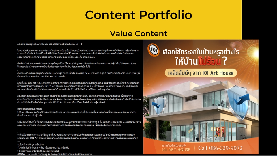 Value Content สื่อสารประโยชน์และคุณค่าธุรกิจของคุณ ให้กลุ่มเป้าหมายรับรู้ และคัดกรองกลุ่มเป้าหมาย เพื่อให้ลูกค้าตัดสินใจได้ง่าย Copywriting ช่วยโน้มน้าวให้กลุ่มเป้าหมายตัดสินใจซื้อสินค้าหรือบริการครับ . ลูกค้าสามารถเลือกประเภทคอนเทนต์ได้และทำการแจ้งได้เลยครับ - วิเคราะห์ข้อมูลธุรกิจก่อนสร้างงานเขียน - สร้าง Value Content เพื่อคัดกรองกลุ่มเป้าหมายและสร้างความน่าเชื่อถือของแบรนด์ - กรณีต้องการ Artwork สามารถสร้างบรีฟกราฟิกได้ครับ หรือ เลือก Package Full Content ได้เลยครับ . - Creative Content จะเป็นคอนเทนต์ที่ต่อยอดจากไอเดียลูกค้า หรือ ข้อมูลที่ลูกค้าต้องการบอกกับกลุ่มเป้าหมาย แต่ไม่สามารถสื่อสารออกมาเป็นคอนเทนต์ได้ ในส่วนนี้ปอนด์จะทำหน้าที่ช่วยเนรมิตรให้เป็นคอนเทนต์เองครับ . - Value Content จะเป็นคอนเทนต์ที่ให้สร้างให้แบรนด์เข้าไปอยู่ในใจลูกค้าได้ โดยคอนเทนต์จะสามารถให้ความรู้ ข้อมูล ประโยชน์ต่อผู้อ่านได้ และสามารถโยงสินค้าเข้าไปในคอนเทนต์ได้ด้วยครับ (หรือเรียกกว่า ขายแต่ไม่ขายนั่นเองครับ) ขั้นตอนการทำงาน 1. พูดคุย รับบรีฟ สอบถามรายละเอียดต่าง ๆ 2. สรุปบรีฟ 3. เริ่มผลิตงาน 4. ส่งตรวจครั้งที่ 1 (หากแก้จะมีการส่งตรวจครั้งที่ 2) 5. ส่งตรวจครั้งที่ 2