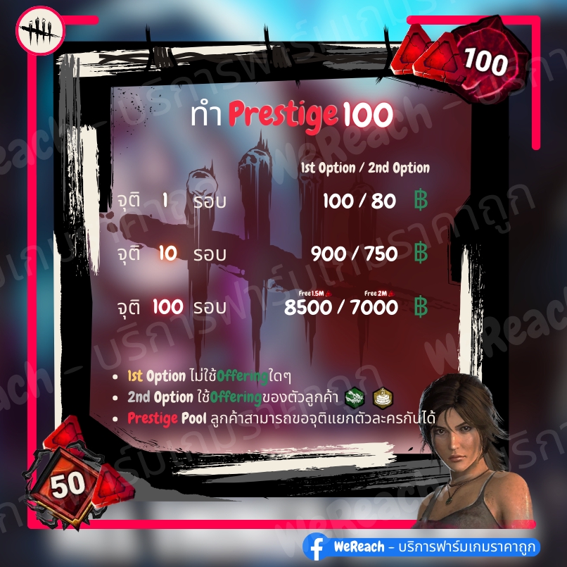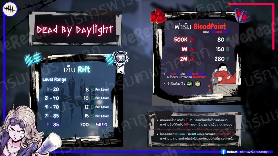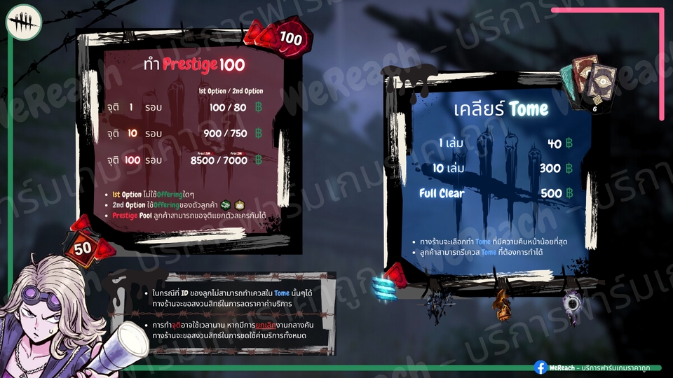 เก็บแต้ม ปั้มแรงค์ จุติ ทำพาส ทำหนังสือ ทุกระบบจบที่นี้ครับ (WeReach - บริการฟาร์มเกมราคาถูก ) ❣️ฟาร์ม Bloodpoint✨ 500K : 80 ฿ 1M : 150 ฿ 2M : 280 ฿ ❣️เก็บ Rift 😍 1 - 20 : 8 ฿ 21 - 41 : 10 ฿ 41 - 70 : 12 ฿ 71 - 85 : 15 ฿ Full Rift : 700 ฿ ❣️ทำPrestige100✨🎉 จุติ1 รอบ : 100/80 ฿ จุติ10 รอบ : 900/750 ฿ จุติ100 รอบ : 8,500/7,000 ฿💸💸💸 ❣️เคลียร์ Tome🔥 1 เล่ม : 40 ฿ 10 เล่ม : 300 ฿ Full Tome : 500 ฿ ขั้นตอนการทำงาน 1. ตกลงงาน 2. มัดจำ 3. ทำงานจนเสร็จ 4. ส่งงาน