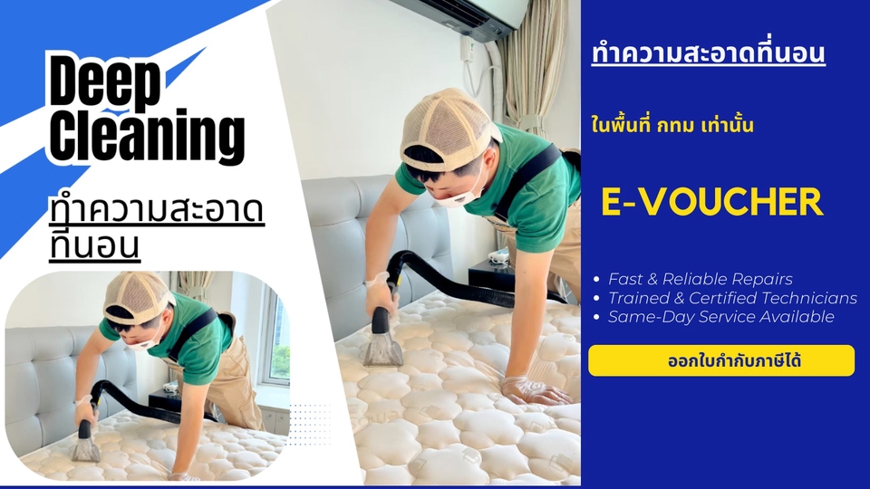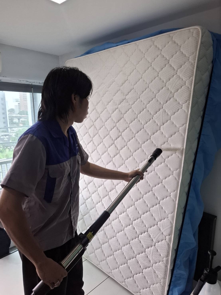 ให้บริการกทม E-Voucher มีอายุ1เดือน 🔹 Deep Clean ที่นอน + อบแห้ง บริการทำความสะอาดที่นอนอย่างล้ำลึก เหมาะสำหรับผู้ที่ต้องการสุขอนามัยสูงสุดและยืดอายุการใช้งานของที่นอน ขั้นตอนการทำงาน 1. ดูดฝุ่น/กำจัดไรฝุ่น ใช้เครื่องดูดกำลังสูงดูดฝุ่น ละออง และไรฝุ่นที่ฝังลึกในใยผ้า 2. ฉีดพ่นน้ำยาฆ่าเชื้อ/สลายคราบ ใช้น้ำยาปลอดภัย ฆ่าเชื้อแบคทีเรีย เชื้อรา และกำจัดกลิ่นอับ ช่วยละลายคราบเหลือง คราบเหงื่อ คราบสกปรกต่าง ๆ 3. ซักล้างระบบ Deep Clean ใช้เครื่องฉีดแรงดัน+ดูดกลับทันที ทำให้สิ่งสกปรกถูกชะล้างออกจากใยผ้า ลดสารก่อภูมิแพ้และคราบที่มองไม่เห็น 4. อบแห้ง ใช้เครื่องอบลมร้อน/โอโซน เพื่อไล่ความชื้นออก ป้องกันการเกิดเชื้อรา ทำให้ที่นอนแห้งเร็ว ไม่อับชื้น 5. ตรวจเช็กความสะอาด ตรวจสอบอีกครั้งก่อนส่งมอบ มั่นใจว่าสะอาดและแห้งสนิท
