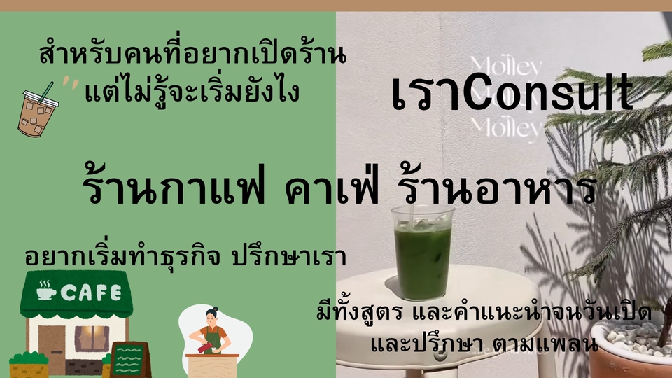 เราให้คำปรึกษาและแนะนำทุกอย่างที่เกี่ยวกับธุระกิจกาแฟเครื่องดื่ม ในส่วนของสูตรเครื่องดื่ม หรือการเลือกเมล็ดกาแฟ ซับพลาย วัตถุดิบ เวิร์คโฟร การทำงานหน้างานหรือเซ็ตอัพร้านต่างๆ สต็อก กลุ่มลูกค้า ขนมในร้าน ครอบคุม ขั้นตอนการทำงาน 1. พูดคุยรายละเอียดผ่านทางไลน์ หรือ โทร วิดีโอคอล 2. สามารถลงพื้นที่ได้แล้วแต่กรณี