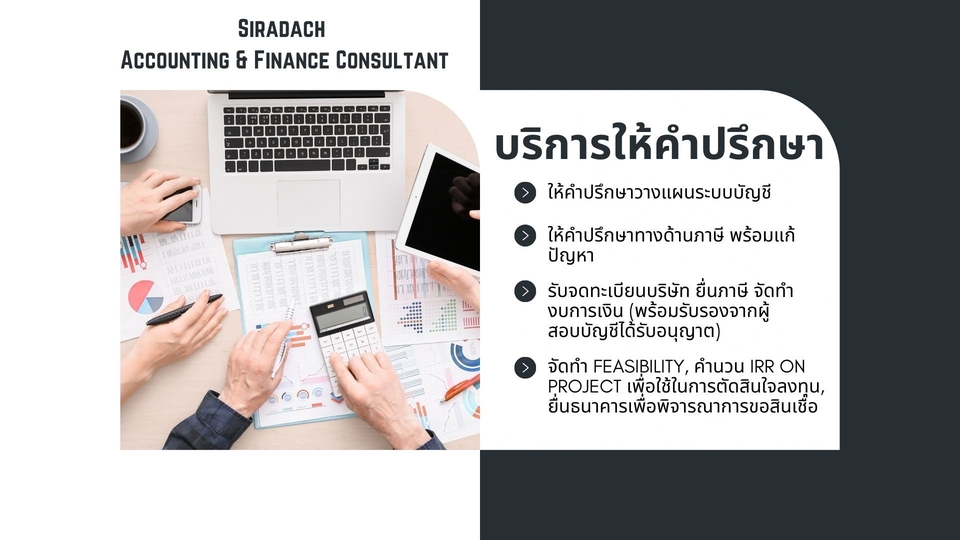บริการให้คำปรึกษาวางระบบบัญชีทั้งระบบ ตั้งแต่เริ่มต้น รวมถึงแนะนำการวางแผนทางภาษี รับทำ รายเดือน/รายปี พร้อมรับรองผู้ทำบัญชีของบริษัท รับตั้งแต่ธุรกิจ Start up จนถึง บริษัทจำกัด ขั้นตอนการทำงาน 1. ส่งรายละเอียด เกี่ยวกับบริษัท และแจ้งความต้องการ 2. หลังจากตรวจสอบเอกสารครบเรียบร้อย นำไปจัดทำบันทึกตามระบบบัญชี 3. นำส่งงบทดลอง งบการเงิน ให้กับบริษัท 4. ตรวจสอบความถูกต้อง 5. ยืนยันความสมบูรณ์ของงาน