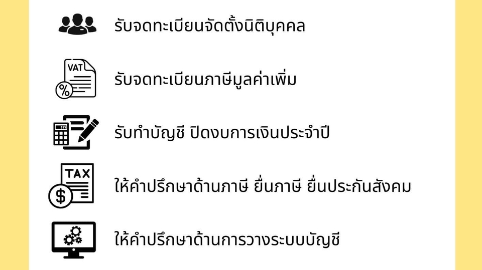 ฿4,000- บันทึกบัญชีรายรับรายจ่าย (เป็นราคาเริ่มต้นสำหรับบริษัทที่มีรายการไม่เกิน 50 รายการ ถ้ารายการมากกว่านี้ สามารถสอบถามได้นะครับ) - ยื่นภาษีที่เกี่ยวข้องในแต่ละเดือน - ให้คำปรึกษา และคำแนะนำที่เกี่ยวข้องตลอดการให้บริการ - ยื่นภาษีกลางปี ภงด.51 - ปิดบัญชีสิ้นปี ทำงบการเงิน พร้อมสอบบัญชี - ยื่นภงด.50, สบช.3, บอจ.5, งบการเงิน E-Filing ทางInternet - ส่งเอกสาร พร้อมหลักฐานทั้งหมดคืนลูกค้า - ส่งสรุป และไฟล์ข้อมูลของบริษัทที่มีให้ทาง E-Mail เมื่อเสร็จงาน