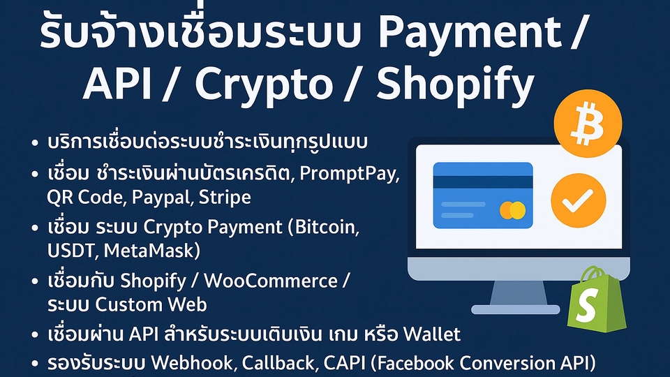 ฿15,000บริการเชื่อมระบบชำระเงินขั้นสูง รวมถึง Crypto Wallet (BTC, USDT, MetaMask), Shopify แบบกำหนดเอง, Facebook Conversion API, Webhook และระบบเติมเงินเกมแบบ Real-time
