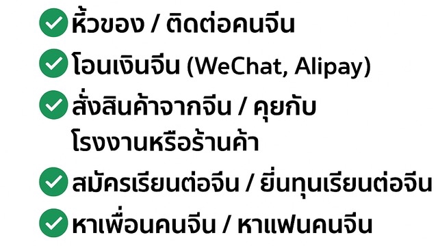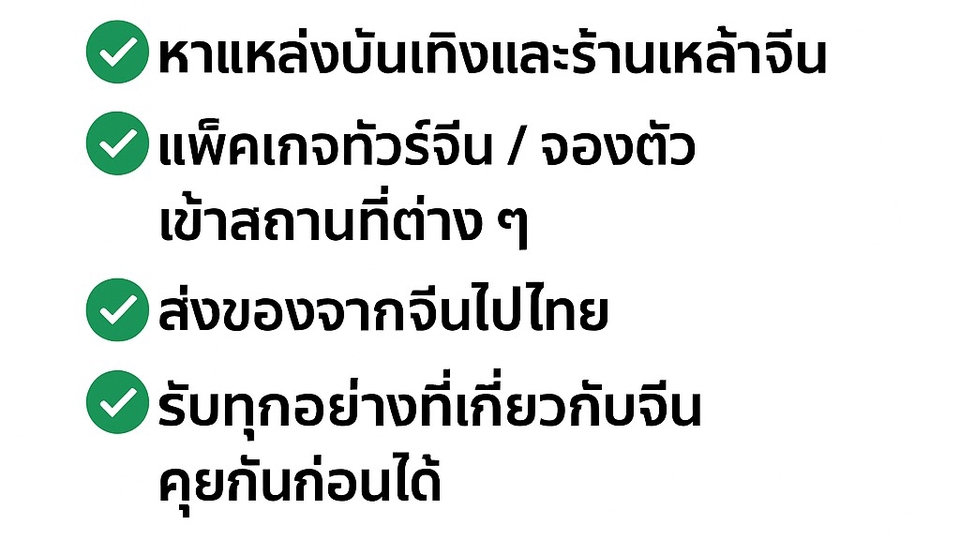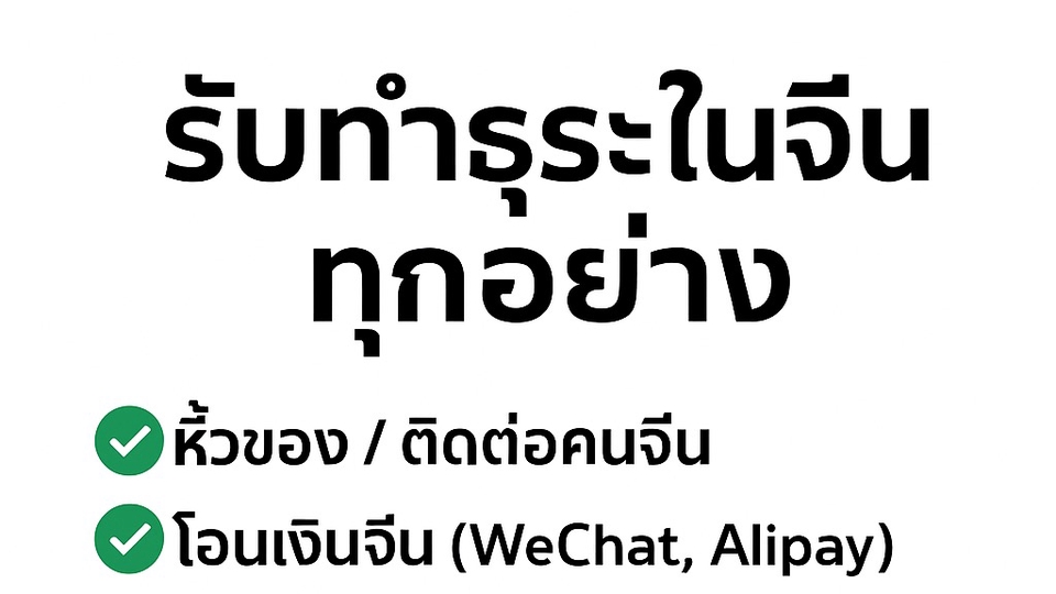 รับทำธุระในจีนทุกอย่าง ✔ หิ้วของ / ติดต่อคนจีน ✔ โอนเงินจีน (WeChat, Alipay) ✔ สั่งสินค้าจากจีน / คุยกับโรงงานหรือร้านค้า ✔ สมัครเรียนต่อจีน / ยื่นทุนเรียนต่อจีน ติดต่อมหาลัยจีน จ่ายค่าเทอม ✔ หาหอพัก/บ้านเช่าในจีน ✔ หาเพื่อนคนจีน / หาแฟนคนจีน ✔ หาแหล่งบันเทิงและร้านเหล้าจีน ✔ หาแพ็คเกจทัวร์จีน / จองตั๋วเข้าสถานที่ต่าง ๆ ✔ ชิปปิ้ง ส่งของจากจีนไปไทย ✅ รับทุกอย่างที่เกี่ยวกับจีน 💬 คุยกันก่อนได้