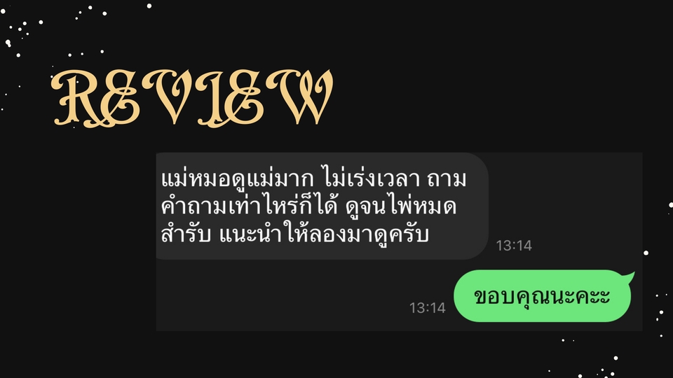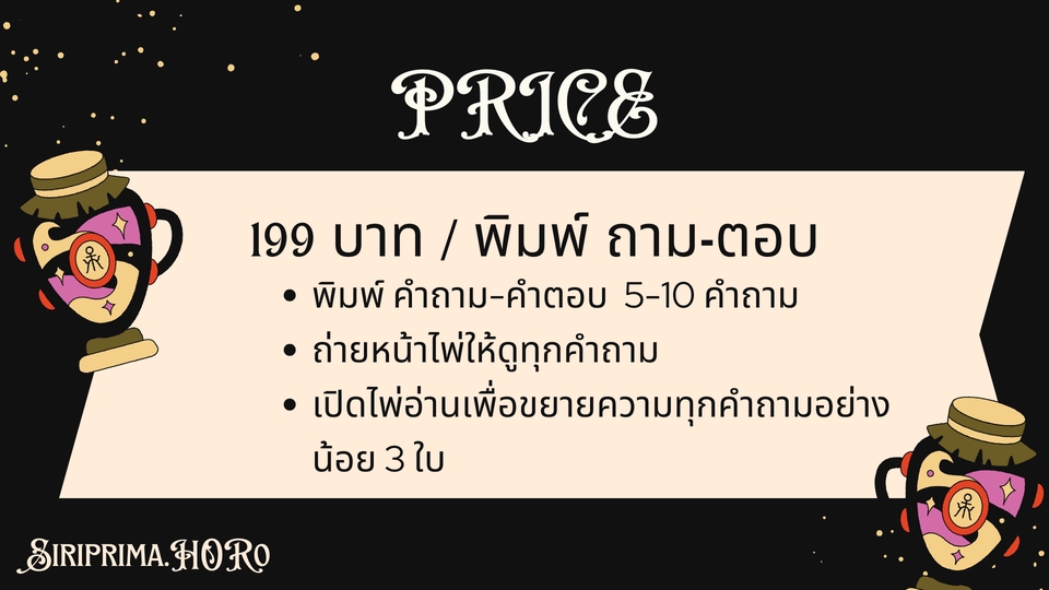฿199-> ดูดวงแบบ พิมพ์คำถาม-คำตอบ 5-10 คำถาม -> ถ่ายหน้าไพ่ให้ดูทุกคำถาม -> เปิดไพ่อ่านเพื่อขยายความทุกคำถามอย่างน้อย 3 ใบ -> กดติดตาม IG/TIKTOK Capture หน้าจอมาให้ ลดไปอีก 20 บาท -> ดำเนินการดูดวงให้หลังจากชำระค่าบริการ ดำเนินการภายใน 1 วัน