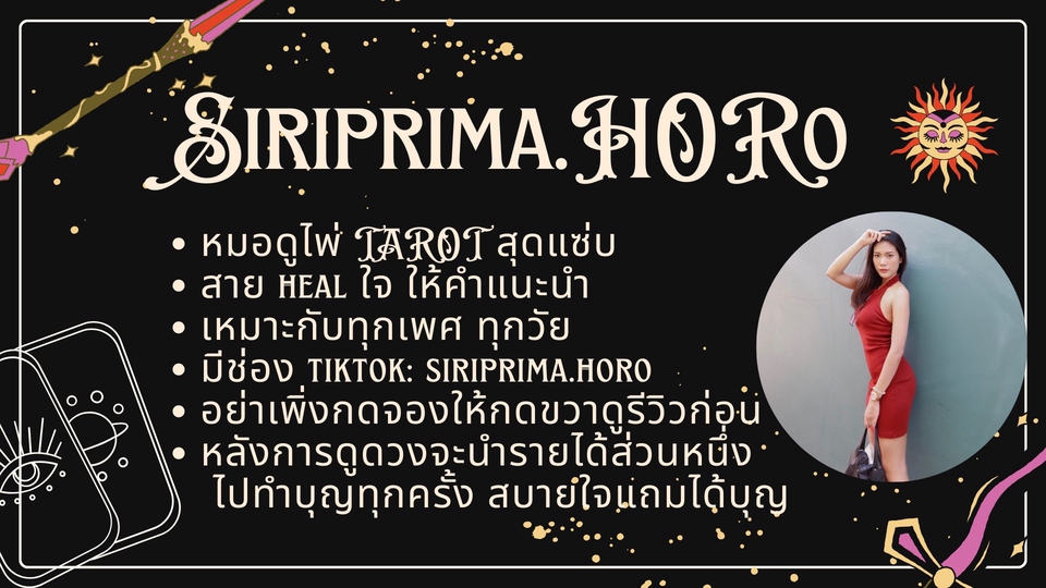 สิริพริมา แม่หมอดูไพ่ Tarot ไพ่ยิปซี จาก Tiktok: siriprima.horo -> รับดูดวง Online มีรีวิวแน่นจุกๆ แม่นๆ -> เหมาะกับทุกเพศ ทุกวัย -> สาย Heal ใจ แนะนำ -> ไม่รับถามเกี่ยวกับความตาย ขั้นตอนการทำงาน 1. เลือกเเพคเกจที่ลูกดวงสนใจ 2. ชำระเงินพร้อมกับแจ้งชื่อ-นามสกุล เพื่อให้แม่หมอจะได้ขออนุญาตเปิดไพ่หาคำตอบให้ 3. อธิษฐานจิตตั้งสมาธิ ให้แม่หมอเปิดไพ่ดูดวงให้ 4. พิมพ์คำถามที่ต้องการ 5. กรณีโทรจะทำการนัดหมายเวลาที่สะดวก