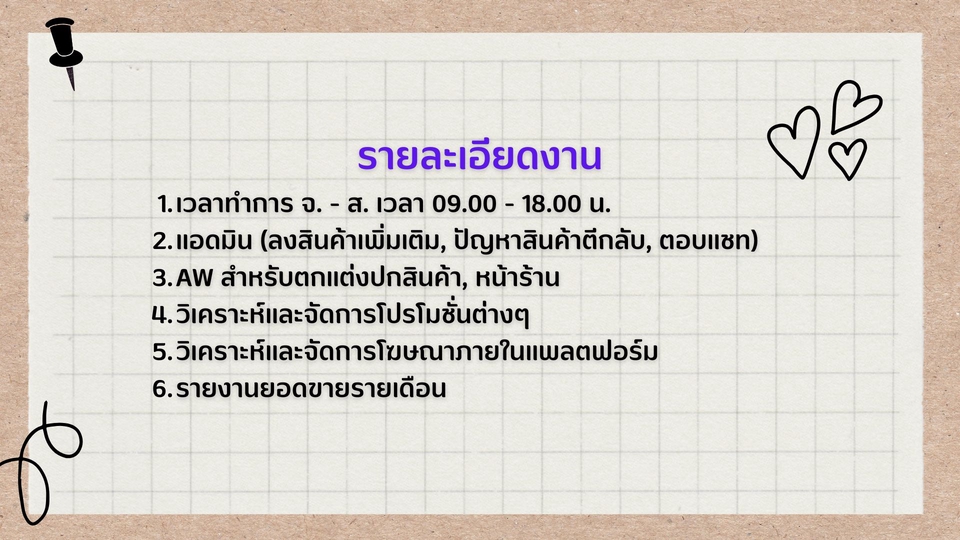 รายละเอียดการทำงาน สามารถพูดคุยต่อรองได้ทางแชท เริ่มต้นแพลตฟอร์มละ 5,000.- . 1. เวลาทำการ จ. - ส. เวลา 09.00 - 18.00 น. 2. แอดมิน (ลงสินค้าเพิ่มเติม, ปัญหาสินค้าตีกลับ, ตอบแชท) 3. AW สำหรับตกแต่งปกสินค้า, หน้าร้าน 4. วิเคราะห์และจัดการโปรโมชั่นต่างๆ 5. วิเคราะห์และจัดการโฆษณาภายในแพลตฟอร์ม 6. รายงานยอดขายรายเดือน . ประสบการณ์บน Marketplace มากกว่า 4 ปี ขั้นตอนการทำงาน 1. พูดคุยรายละเอียดการทำงาน 2. ยื่นขอเสนอ
