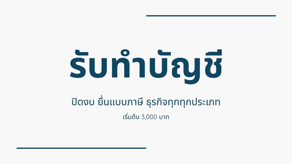 ฿5,000สำหรับธุรกิจ SME ประกอบด้วยบันทึกรายรับ-จ่าย (ไม่เกิน 70 รายการ), จัดทำ/ยื่นภาษีมูลค่าเพิ่มและภาษีหัก ณ ที่จ่าย (ไม่เกิน 7 แบบ), ปิดงบประจำปี,ยื่นภาษีเงินได้นิติบุคคล(ภ.ง.ด.50/51) ให้คำปรึกษาไม่จำกัด