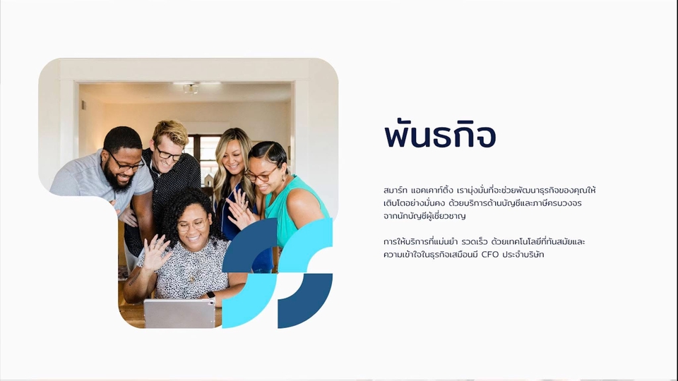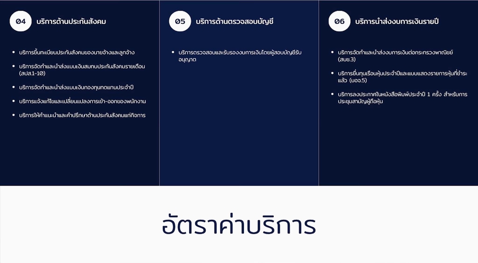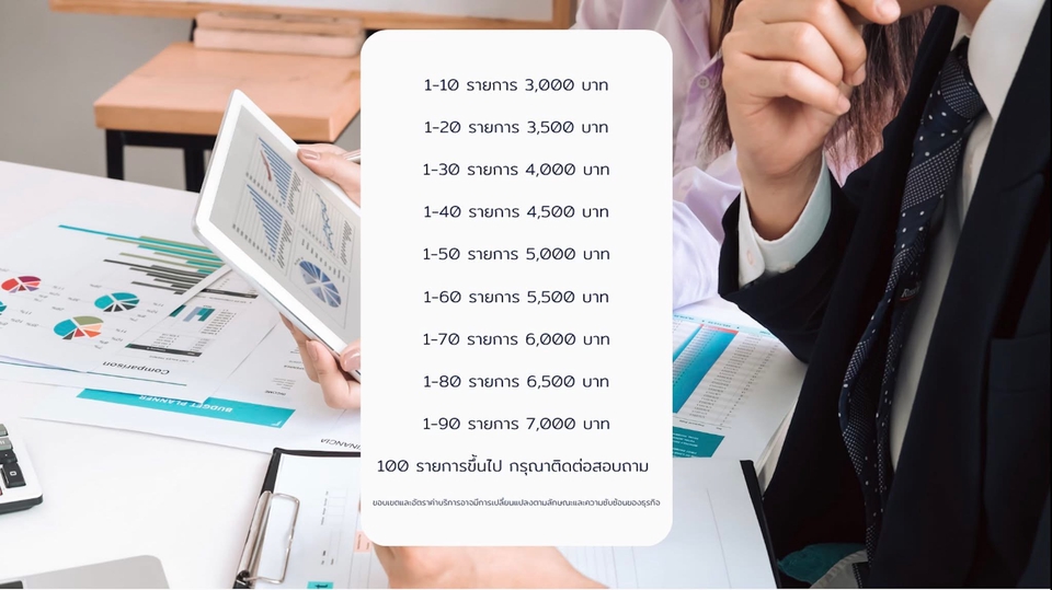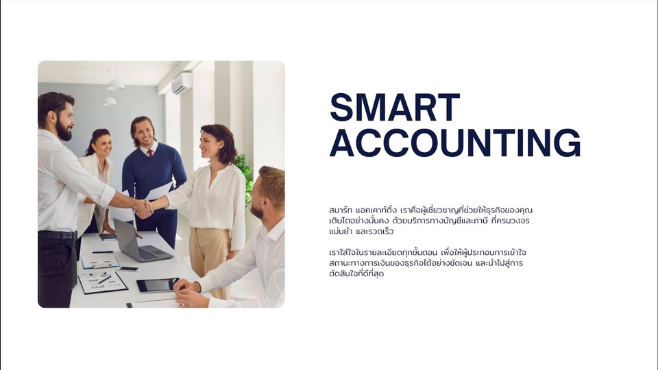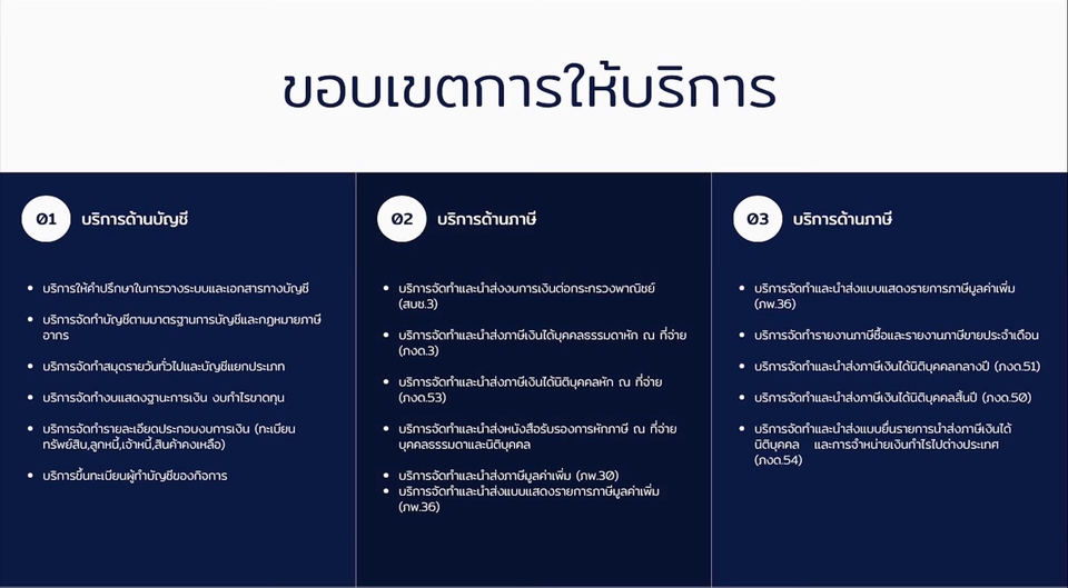 เพิ่มประสิทธิภาพธุรกิจของคุณ ด้วยบริการบัญชีและภาษีแบบครบวงจรจากผู้เชี่ยวชาญ บริการของเราครอบคลุม - จัดทำบัญชีรายเดือน/รายปี - จัดทำและยื่นแบบภาษี ภ.พ.30,36 ภงด.1,3,50,51,53,54 - จัดทำงบการเงินพร้อมยื่นงบกับกรมพัฒนาธุรกิจการค้า - ให้คำปรึกษาด้านภาษี วางแผนภาษีธุรกิจ - บริการขึ้นทะเบียนนายจ้าง-ประกันสังคม เราพร้อมเป็นส่วนหนึ่งในการขับเคลื่อนธุรกิจของคุณให้เติบโตอย่างมั่นคงและยั่งยืน