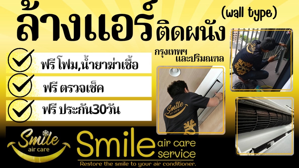 สมาย แอร์ แคร์ คืนรอยยิ้มให้แอร์คุณ บริการล้างแอร์ทุกประเภททุกขนาดBTU หลังจากทำงานเหนื่อยมาทั้งวัน แค่ได้เอนหลังบนเตียงนุ่มๆแล้วเปิดแอร์และสัมผัสกับความเย็นที่มาพร้อมกลิ่นหอมสดชื่น แค่นี้ก็ช่วยให้หายเหนื่อยได้ไม่น้อย " คิวด่วน จะจองเช้าล้างเย็น หรือจองเย็นล้างพรุ่งนี้ ไม่บวกเพิ่ม❗" เรามีช่างมากประสบการณ์การณ์พร้อมบริการคุณ พื้นที่กรุงเทพฯและปริมูณฑล ฟรี!ล้างด้วยน้ำยาฆ่าเชื้อลดกลิ่นอับ ฟรี!ประกันน้ำหยด30วัน ฟรี!ตรวจเช็ค รอยยิ้มของคุณคือรอยยิ้มของเรา