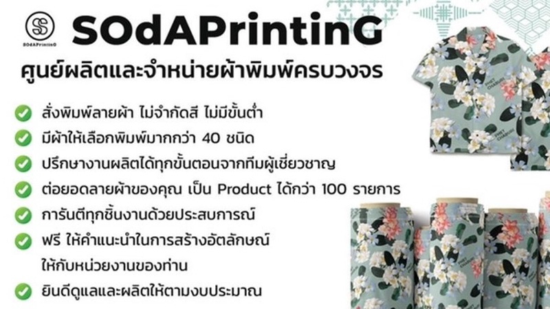 SOdAPrintinG OEM รับผลิตผ้าพิมพ์ลาย พรีเมียม บริการประทับใจ 👉 มีผ้าให้เลือก 8 ชนิดผ้า 👉 หน้ากว้างผ้า 60 นิ้ว = 152.4 cm.//พื้นที่พิมพ์ลาย 140 cm. 👉 งานลูกค้า องค์กร โรงแรม รีสอร์ท หน่วยงาน #SOdAPrintinG รับหมด จบ ในที่เดียว 👉 อยากจะเลือกลายแพทเทิน สัดส่วน หรือ packaging ที่มีความพิเศษไม่เหมือนใคร ทางเราก็มีทีมออกแบบที่คอยดูแลด้านนี้ (มีค่าใช้จ่ายเพิ่มเติมในการออกแบบ) 👉 ผลิตด้วยระบบ Digital Print เป็นมิตรต่อสิ่งแวลล้อม มี Certificate รับประกัน 👉 มีโรงงานผลิตของเราเอง ใส่ใจทุกขั้นตอนการผลิต รับประกันคุณภาพสินค้าทุกชิ้น ขั้นตอนการทำงาน 1. ลูกค้าเลือกแพ็คเกจที่ต้องการสั่งผลิตสินค้า 2. ลูกค้าส่งแบบลายสินค้าที่ต้องการผลิตให้กับทางร้าน ภายใน 1-3 วันหลังจากชำระเงิน 3. ลูกค้าเลือกประเภทผ้าที่ต้องการ พร้อมแจ้งกับทางร้านผ่านทาง Inbox 4. ทางร้านส่ง Mock up สินค้าให้ลูกค้าคอนเฟิร์ม ภายใน 1-2 วันหลังจากลูกค้าส่งแบบลายสินค้า 5. ทางร้านผลิตสินค้าตามรายการสั่งผลิต ระยะเวลาการผลิตภายใน 2-5 วันทำการ หลังจากอนุมัติการผลิต 6. จัดส่งสินค้าให้กับทางลูกค้า