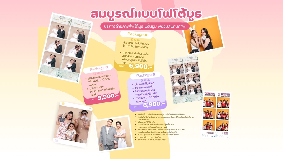 ถ่ายไม่อั้น..ปริ้นไม่จำกัด📸 ✨ถ่ายปุ๊บ ปริ้นปั๊บ รับภาพได้ทันที ✨ถ่ายได้ไม่จำกัดจำนวนครั้ง ✨Airdrop / ScanQR พร้อมรับรูปผ่านมือถือได้ทันที ✨ปริ้นภาพได้ไม่จำกัด ✨ได้ไฟล์ภาพฉบับเต็ม พร้อมไฟล์ดุ๊กดิ๊ก .GIF ✨ภาพสวย ขาวใส คมชัด คุณภาพดี ✨ฟรีออกแบบเทมเพลต ✨มีพร็อพแน่น ๆ ให้เลือกมากมาย ✨ถ่ายด้วยกล้อง Fullframe พร้อมชุดไฟสตูดิโอ ✨ฉากกว้างถึง 2.7 เมตร ✨มีจอแสดงภาพขนาดใหญ่ ✨ทีมงานดูแลพร้อมบริการให้คำแนะนำตลอดงาน ✨ขนาดรูปให้เลือก 2*6 และ 4*6 ⭐️Promotion Size 2*6 ⭐️ ⭐️2 Hr 6,900฿ ⭐️3 Hr 7,900฿ ⭐️4 Hr 9,900฿ ⭐️Promotion Size 4*6 ⭐️ ⭐️2 Hr 9,900฿ ⭐️3 Hr 10,900฿ ⭐️4 Hr 11,900฿