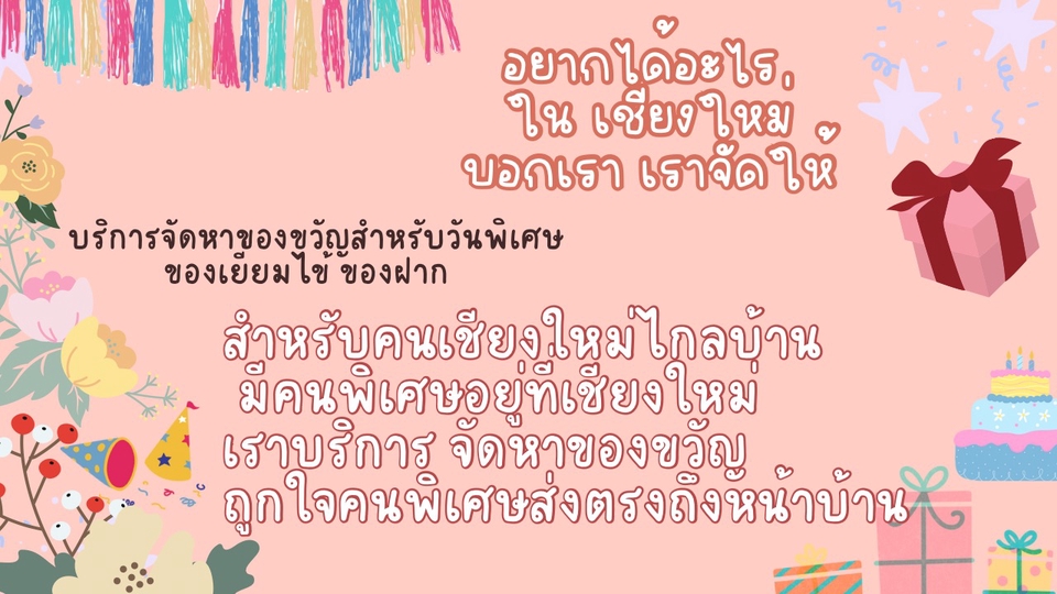 🔖คนเจียงใหม่ อยู่ไกลบ้าน อยากส่งของขวัญ ของใช้ ขนม อาหาร เราจัดหาและจัดส่งให้ถึงหน้าบ้าน ความพิเศษคือ สามารถเพิ่มการ์ด ข้อความ ได้ 😍คิดถึงคุณครูสมัยเรียนที่เชียงใหม่ อยากส่งดอกไม้ ขนมอร่อย เราส่งให้ พร้อมอัพเดทด้วยรูปภาพ หรือวีดีโอคอลได้เลย ค่า ❤️ 😆 เพื่อนรักห่างกันนาน อยากเซอร์ไพร์ ของขวัญวันเกิด เราจัดให้ 😍คิดถึงแฟนเก่า อยากส่งขนมอร่อยให้ เราส่งแบบเป็นความลับ ไม่มีใครรู้ รู้แค่คุณกับเขา (** แต่ต้องไม่สร้างความร้าวใจให้ใครนะ ) 😄คิดถึงอาหารเหนือ ร้านดั่งเดิม จะให้เราจับดหาส่งให้หรือจ้างไปกินแทนก็ยังได้ 😂 😁อยากได้วิว บรรยากาศเชียงใหม่ ลงสตอรี่ ลงโพสต์ ก็ทำให้