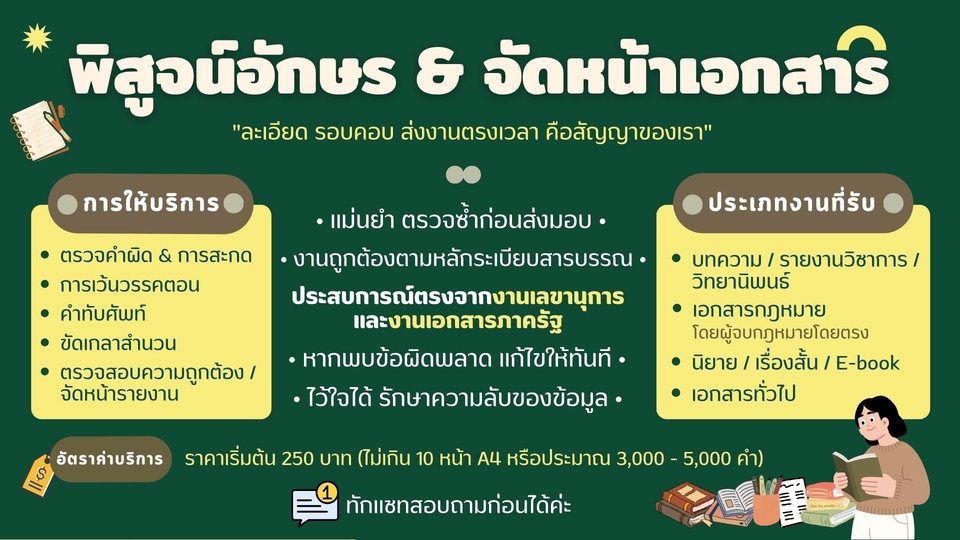 รายละเอียดงาน • พิสูจน์อักษร & จัดหน้าเอกสาร โดยอดีตเลขานุการผู้บริหาร และประสบการณ์งานเอกสารภาครัฐ/เอกสารกฎหมาย • เน้นความละเอียดละออ ความถูกต้องตามหลักภาษา และความสวยงาม • ตรวจทานเอกสารทุกระเภท ตรวจทานข้อมูลซ้ำ 2 รอบ ก่อนส่งมอบงานเสมอ เพื่อให้งานของคุณดูเป็นมืออาชีพ ถูกต้องตามหลักระเบียบงานสารบรรณ ไม่ว่าจะเป็นบทความ รายงานวิชาการ วิทยานิพนธ์ เอกสารกฎหมาย หรือเอกสารทางราชการ ขอบเขตการทำงาน • รับตรวจบทความ รายงานวิชาการ วิทยานิพนธ์ นิยาย เรื่องสั้น และเอกสารทั่วไป • รับตรวจเอกสารรายงานราชการ และเอกสารทางกฎหมายโดยผู้ที่จบนิติศาสตร์โดยตรง • พิสูจน์อักษร: ตรวจคำผิด การสะกดคำ การใช้คำทับศัพท์ การเว้นวรรคตอน และการใช้เครื่องหมายวรรคตอนให้ถูกต้อง • ขัดเกลาสำนวน: ปรับรูปประโยคให้สละสลวย อ่านง่าย และเป็นทางการ • จัดหน้าเอกสาร: จัดรูปแบบ (Formatting) กั้นหน้า - กั้นหลัง ตามระเบียบงานสารบรรณ หรือรูปแบบที่กำหนด • ตรวจสอบความถูกต้อง: เช็กความสอดคล้องของเนื้อหาและสารบัญ ประสบการณ์ • อดีตเลขานุการผู้บริหาร ที่ทำหน้าที่ตรวจทาน/กลั่นกรองเอกสารก่อนเสนอผู้บริหาร • อยู่กับระบบราชการ และงานเอกสารภาครัฐ มาอย่างต่อเนื่องยาวนาน ขั้นตอนการทำงาน • ลูกค้าส่งไฟล์ (Word/PDF) เพื่อประเมินจำนวนหน้าและเนื้อหา • ตรวจทานอย่างละเอียด และส่งมอบไฟล์ Track Changes เพื่อให้ลูกค้าเห็นจุดที่แก้ไข/เกลาสำนวนทั้งหมดอย่างชัดเจน • ส่งมอบไฟล์ Final ที่แก้ไขแล้วพร้อมใช้งานทันที หลังลูกค้าตรวจสอบแล้ว สิ่งที่ลูกค้าจะได้รับ • งานเอกสารดูเป็นมืออาชีพ ถูกต้องตามหลักภาษาไทย สวยงามและอ่านง่าย • ส่งงานตรงเวลา: การันตีส่งงานตามกำหนด ไม่ทิ้งงานแน่นอน • รักษาความลับ: ข้อมูลลูกค้าถือเป็นความลับสูงสุด 100% • หากพบความผิดพลาด ยินดีแก้ไขให้ทันที