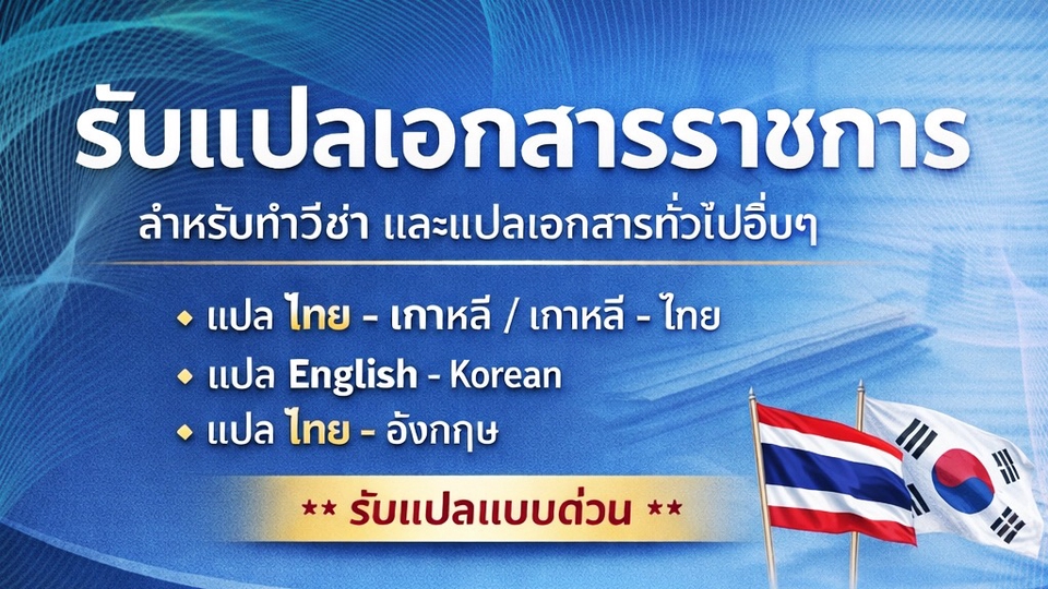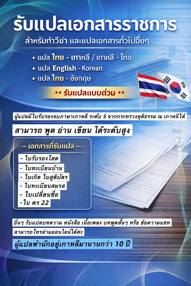แปลภาษา เกาหลี - ไทย / ไทย - เกาหลี / เกาหลี-อังกฤษ / อังกฤษ-เกาหลี รับ งานด่วน งานรีบ เริ่มต้น 300-600 บาท แปลเอกสารสำคัญเพื่อทำวีซ่า ทะเบียนสมรส ใบเกิด ใบเปลี่ยนชื่อ สำเนาทะเบียนบ้าน ใบ คร.2 แปลข้อความ บทความ หนังสือ ข้อความถึงไอดอล เนื้อเพลง ผู้แปลมีใบรับรองจากกระทรวงยุติธรรมของประเทศเกาหลี จบภาษาเกาหลี พูด อ่าน เขียน ระดับสูง 5 단계 รับงานล่ามทางมือถือ/ช่องทางแชท Line / Kakao แบบด่วน