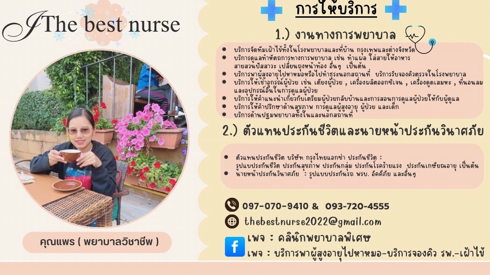 ยินดีให้บริการด้านคำปรึกษาด้านสุขภาพ และบริการเฝ้าไข้ผู้ป่วยเด็กและผู้สูงอายุทั้งที่ รพ.และที่บ้าน และบริการทางการพยาบาลการทำแผล-ใส่สายให้อาหาร-ใส่สายสวนปัสสาวะ และหัตถการทางการพยาบาลต่างๆที่บ้านภายใต้คำสั่งแพทย์ และให้บริการสแตนบายงานนอกสถานที่ และพี่เลี้ยงเด็ก ( พยาบาลแพรยินดีให้บริการค่ะ ) โดยพยาบาลประสบการณ์มากกว่า 10 ปีค่ะ