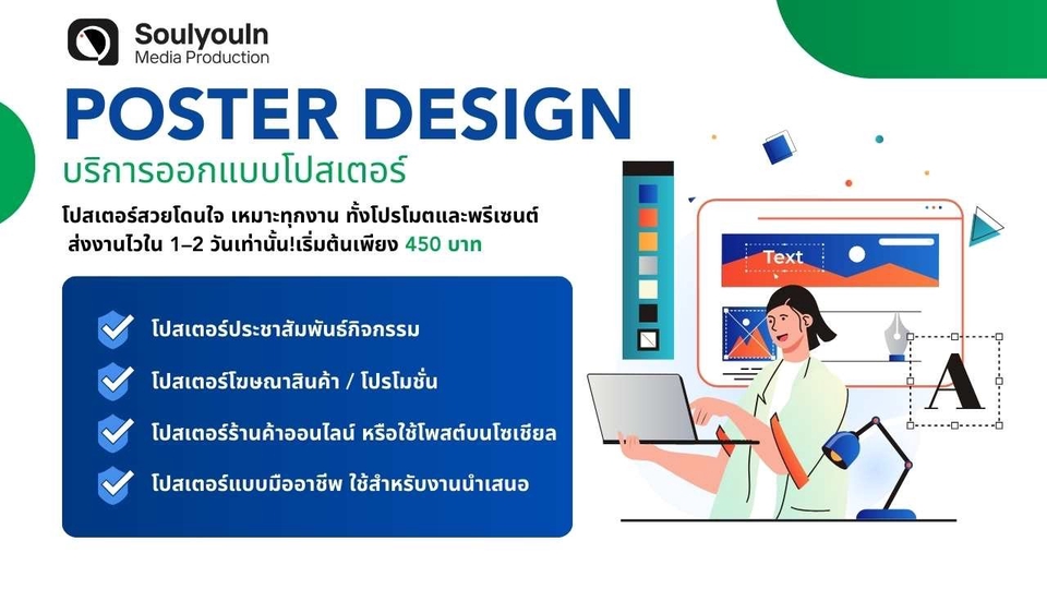✅ เหมาะสำหรับ: -โปสเตอร์ประชาสัมพันธ์กิจกรรม -โปสเตอร์โฆษณาสินค้า / โปรโมชั่น -โปสเตอร์คอนเสิร์ต / อีเวนต์ / นิทรรศการ -โปสเตอร์ร้านค้าออนไลน์ หรือใช้โพสต์บนโซเชียล -โปสเตอร์แบบมืออาชีพ ใช้สำหรับงานนำเสนอ / รายงาน / สื่อการเรียนการสอน 🛠 สิ่งที่ลูกค้าจะได้รับ: - ไฟล์ภาพความละเอียดสูง .JPG / .PNG - แก้ไขงานได้ [ใส่จำนวนครั้ง เช่น 2 ครั้ง] - ขนาดไฟล์ตามที่ลูกค้าต้องการ (A4, A3, Instagram, Facebook, ฯลฯ) - หากต้องการไฟล์ต้นฉบับ (.PSD / .AI) มีค่าใช้จ่ายเพิ่มเติมเล็กน้อย 📌 สิ่งที่ลูกค้าต้องเตรียม: - ข้อความที่ต้องการใส่ในโปสเตอร์ (ชื่อกิจกรรม, วันเวลา, รายละเอียด ฯลฯ) - รูปภาพประกอบ (ถ้ามี) เช่น โลโก้, ภาพสินค้า, ภาพวิทยากร ฯลฯ - โทนสี / สไตล์ที่ต้องการ (ถ้ามีตัวอย่างงานที่ชอบสามารถแนบมาได้) - ขนาดของโปสเตอร์ ⏱ ระยะเวลาทำงาน: ส่งงานภายใน [ 1-2 วันทำการ] หลังจากได้รับข้อมูลครบถ้วน 💰 ราคาเริ่มต้น: เริ่มต้นที่ เช่น 450 บาท / ชิ้น (ขึ้นอยู่กับความยากง่ายและรายละเอียดของงาน)