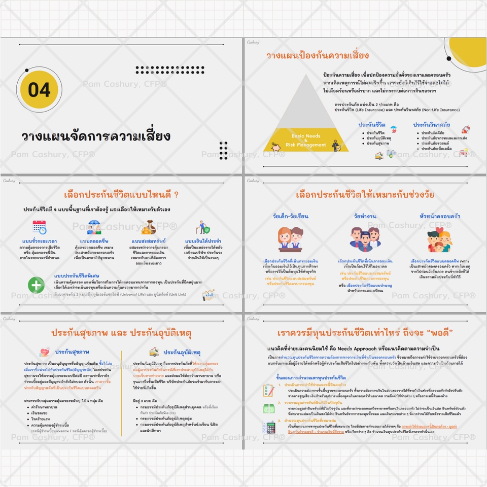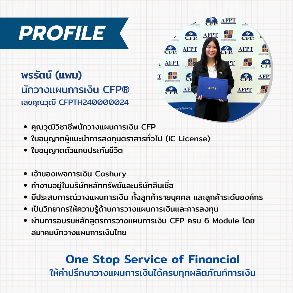 หากเพื่อนๆ กำลังมองหานักวางแผนการเงิน CFP® เพื่อขอคำปรึกษาด้านการวางแผนการเงินต่างๆ เรายินดีให้คำปรึกษาและแนะนำการวางแผนการเงินที่ถูกหลัก สวัสดีค่ะ แพม "พรรัตน์ โสภณธนกิจ" นักวางแผนการเงินอิสระ ที่ได้รับคุณวุฒิ CFP (Certified Financial Planner) ยินดีให้คำปรึกษา วางแผน และออกแบบแผนประกันตามความต้องการ เพราะ "ประกันที่ใช่' ควรจะออกแบบให้เข้ากับไลฟ์สไตล์การใช้ชีวิตและงบประมาณของแต่ละคน สิ่งที่ลูกค้าจะได้รับ - ถาม-ตอบเรื่องประกันที่สงสัยแบบส่วนตัว - สรุปแผนประกันและความคุ้มครองที่มีในปัจจุบัน - ตรวจสุขภาพทางการเงิน ให้คำแนะนำการวางแผนการเงินส่วนบุคคลที่ถูกหลัก - ปูพื้นฐานการวางแผนประกัน การวางแผนภาษี - นำเสนอแผนประกันที่เหมาะสม เพื่อเป็นไอเดียในการหาประกันที่เหมาะสม - หากสนใจประกันแผนไหน สามารถเช็คเบี้ยและวางแผนงบประมาณสำหรับการจ่ายเบี้ยประกันในระยะยาว ขั้นตอนการทำงาน 1. พูดคุยสอบถามข้อมูลและความต้องการ 2. นำข้อมูลมาวิเคราะห์และออกแบบประกันที่เหมาะสม ภายใต้บงบประมาณที่ต้องการ 3. นำเสนอรายละเอียดแผนประกัน และอธิบายความคุ้มครองต่างๆ 4. ผู้รับคำปรึกษาสอบถามข้อสงสัยต่างๆ 5. ติดตามแผนทางการเงิน และอัพเดทข้อมูลอื่นๆ เพิ่มเติมให้ต่อเนื่อง (สำหรับผู้ที่สนใจ)