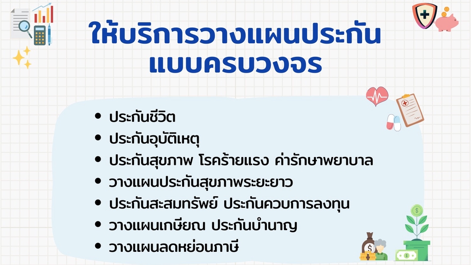 ฿500- ให้คำแนะนำเกี่ยวกับการวางแผนประกัน - สรุปกรมธรรม์ที่ถือครองอยู่ - สอบถามความคุ้มครองที่ต้องการ และทำ Financial Health Check - นำเสนอแผนประกันที่เหมาะสม - คำนวณการลดหย่อนภาษีจากประกัน
