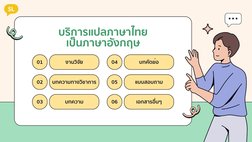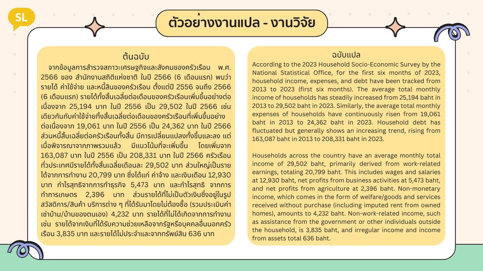 บริการแปลภาษางานวิจัย บทความ บทความทางวิชาการ แบบสอบถาม จดหมาย สัญญา และเอกสารอื่นๆ จากภาษาไทยเป็นภาษาอังกฤษ โดยผู้เชี่ยวชาญที่มีประสบการณ์การทำงานวิจัยหลากหลายด้าน ไม่ว่าจะเป็นงานวิจัยด้านธุรกิจ งานวิจัยด้านการแพทย์และการพยาบาล งานวิจัยด้านการท่องเที่ยวและการโรงแรม งานวิจัยด้านทรัพยากรบุคคล งานวิจัยด้านการพัฒนาสังคมศาสตร์ งานวิจัยด้านจิตวิทยา และงานวิจัยด้านอื่นๆ อีกมากมาย ขั้นตอนการทำงาน 1. ลูกค้าส่งงานต้นฉบับภาษาไทยเพื่อทำการประเมินราคา 2. ออกใบเสนอราคาให้ลูกค้า 3. แปลภาษาจากภาษาไทยเป็นภาษาอังกฤษ 4. ส่งมอบงานแปลฉบับภาษาอังกฤษให้ลูกค้า ลูกค้าจะได้รับเป็นไฟล์ Word และ PDF