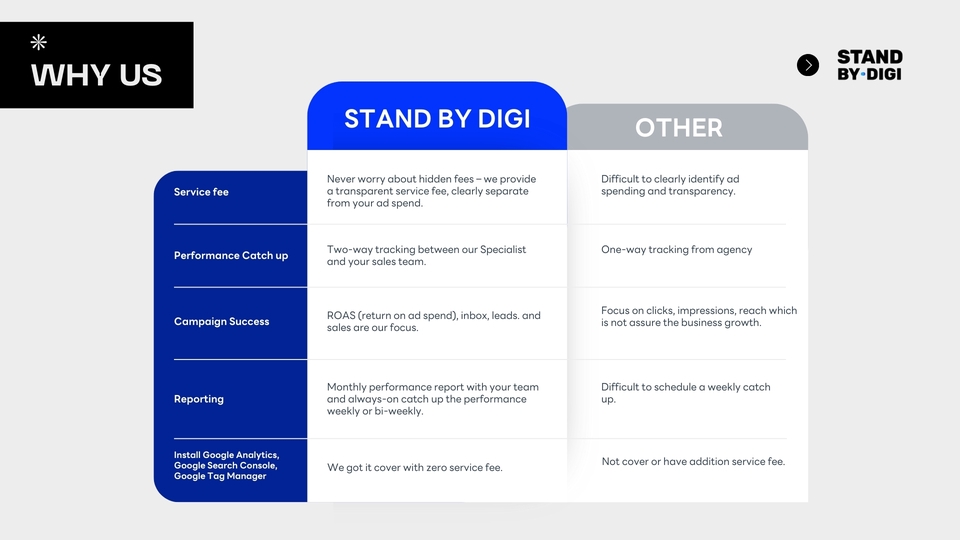 ฿89,000แพ็กเกจนี้เหมาะกับธุรกิจที่ต้องการพาร์ทเนอร์ทางการตลาดระยะยาว เพื่อวางกลยุทธ์แบบครบวงจร พร้อมติดตามและปรับแผนอย่างต่อเนื่องในทุกไตรมาส ช่วยขยายฐานลูกค้าและยอดขายอย่างมั่นคง