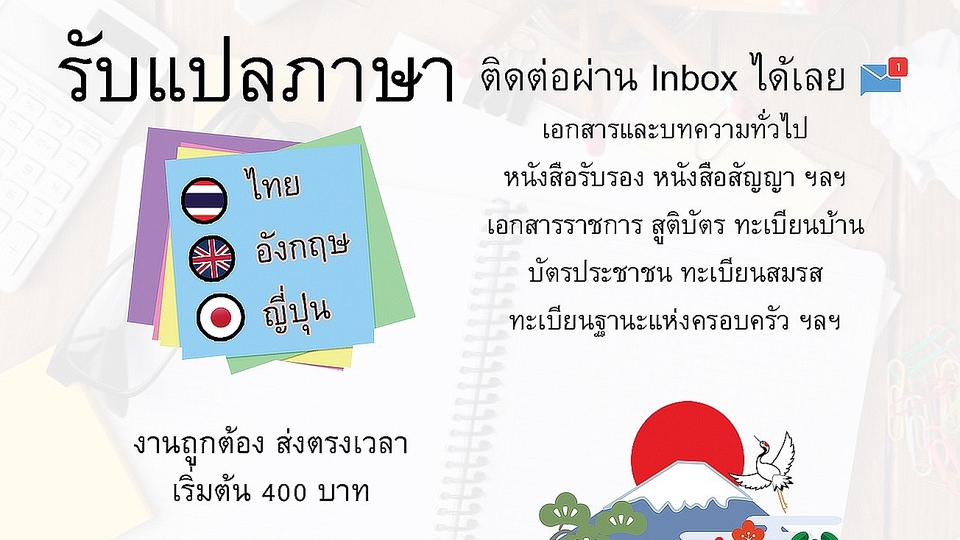 บริการแปลภาษาไทย-อังกฤษ-ญี่ปุ่น มีประสบการณ์ในการแปลมากกว่า 10 ปี สามารถจัดแปลเอกสารทั่วไป เมนูอาหาร อีเมล์ เอกสารราชการ สูติบัตร มรณบัตร ทะเบียนบ้าน บัตรประชาชน ทะเบียนสมรส ใบหย่า ทะเบียนฐานะแห่งครอบครัว หนังสือสัญญา สัญญาบริษัท สัญญาจ้าง ออกแบบเรซูเม่ ฯลฯ ลูกค้าถ่ายรูปหรือสแกนเอกสารต้นฉบับ ผู้แปลเสนอราคาและแจ้งระยะเวลาให้แก่ลูกค้า ลูกค้าชำระค่าแปลเพื่อเริ่มงานแปล ดำเนินการแปลานตามระยะเวลาที่กำหนด จัดส่งไฟล์งานให้ลูกค้า