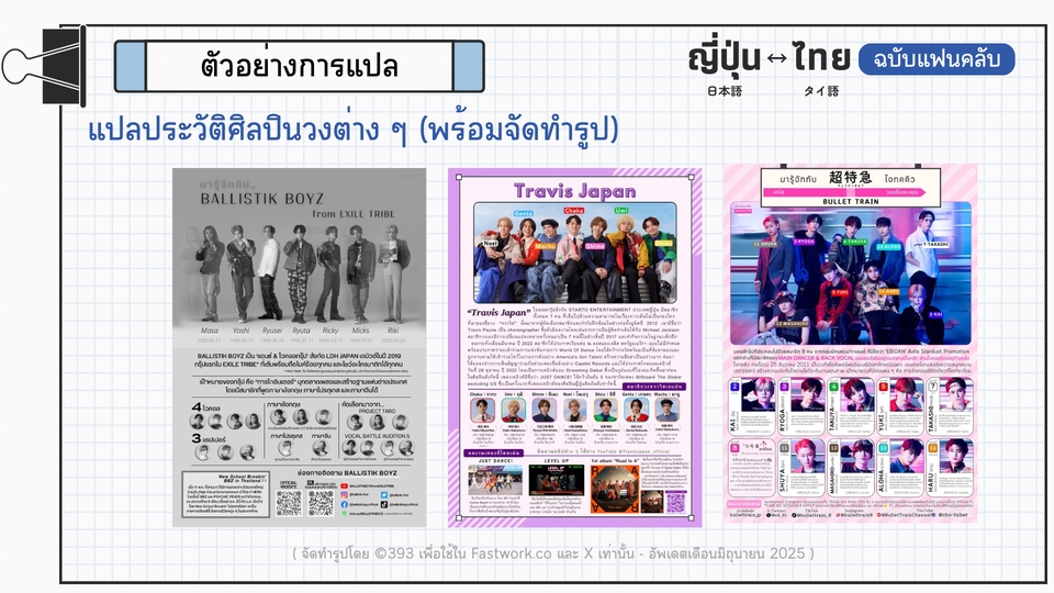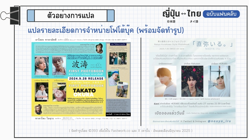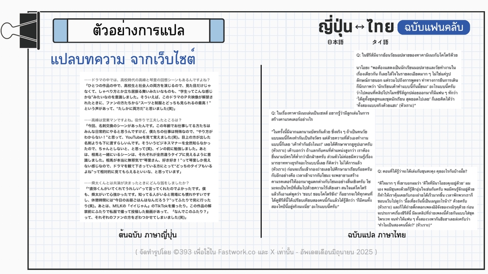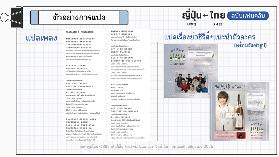 รายละเอียดงาน 💫 รับแปล ญี่ปุ่น-ไทย / ไทย-ญี่ปุ่น “ฉบับแฟนคลับ” 🔥 รับงานด่วน งานเร่ง ตามสะดวก 🔥 - แปลบทความ บทสัมภาษณ์ ตามนิตยสารหรือเว็บไซต์ - แปลจากข้อความ, รูปภาพ, คลิปสั้น ตามโซเชียลมีเดีย - แปลกติกา เงื่อนไข เช่น การซื้อสินค้า การเข้างานแฟนไซน์ การซื้อบัตรคอนเสิร์ต - เขียนข้อความ จดหมาย แปลสคริปต์แฟนไซน์ 💫 ตรวจสอบความเรียบร้อยถูกต้องของข้อความ/จดหมาย ก่อนส่งถึงศิลปิน 💫 ใช้ภาษาญี่ปุ่นที่เป็นธรรมชาติ ถูกต้องตามหลักภาษา ※ ไม่รับงานด้านวิชาการ/กฎหมาย/เอกสารทางราชการ ประสบการณ์และความเชี่ยวชาญ - เคยแปลบทความ ญี่ปุ่น→ไทย และเรียบเรียงเป็นสำนวนของตนเอง ลงในเว็บไซต์ที่รวบรวมบทความข่าวสารต่าง ๆ เกี่ยวกับประเทศญี่ปุ่น (Anngle) - เคยล่ามแบบพูดตาม ญี่ปุ่น↔︎ไทย ระหว่างไอดอลและแฟนคลับ ขั้นตอนการทำงาน 1️⃣ลูกค้าแจ้งลักษณะงาน / ความเร่งรีบ** (อาจมีค่าใช้จ่ายเพิ่มเติม) 2️⃣ฟรีแลนซ์ตอบรับ ขอข้อมูลที่ต้องการให้แปล เพื่อประเมินราคาและระยะเวลาการทำงาน แจ้งให้ลูกค้าทราบ 3️⃣ลูกค้าตกลงและชำระเงินภายในแอพ Fastwork 4️⃣ฟรีแลนซ์ส่งงานให้ตรวจสอบตามชนิดไฟล์ที่ต้องการ ให้ลูกค้าตรวจสอบความเรียบร้อย (หากพบจุดที่ต้องการแก้ไข นอกเหนือจากจุดผิดพลาดของฟรีแลนซ์เอง ลูกค้าสามารถขอแก้ไขได้ในขั้นตอนนี้ 2 ครั้ง) 5️⃣ฟรีแลนซ์ส่งมอบงานที่สมบูรณ์ให้ลูกค้า