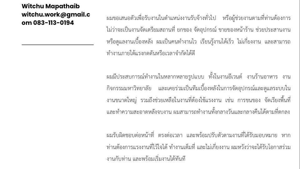 ผมเป็นคนที่พร้อมทำงานในทุกบทบาทที่อยู่ภายใต้กรอบของกฎหมายและจรรยาบรรณวิชาชีพ ด้วยความเชื่อว่า “ไม่มีงานใดเล็กเกินไป และไม่มีหน้าที่ใดที่ไม่สำคัญ” ผมพร้อมยืดหยุ่นและปรับตัวให้เข้ากับทุกสถานการณ์ เพื่อให้ภารกิจของทีมเดินหน้าได้อย่างราบรื่นที่สุด ตลอดช่วงที่ผ่านมา ผมมีโอกาสรับผิดชอบงานที่หลากหลาย ไม่ว่าจะเป็นการจัดเตรียมสถานที่และอุปกรณ์ในอีเวนต์ การช่วยเหลืองานบริการลูกค้า การประสานงานเบื้องหลัง รวมถึงการช่วยเหลือในด้านเอกสารและข้อมูลวิเคราะห์ งานเหล่านี้สอนให้ผมเข้าใจภาพรวมของการทำงานร่วมกับทีม ทั้งในส่วนที่มองเห็นและในส่วนที่ต้องอาศัยความอดทน ความแม่นยำ และความรับผิดชอบ ผมไม่เลือกงานตามตำแหน่ง แต่เลือกที่จะเป็นฟันเฟืองที่ทำให้ระบบทำงานได้ดีที่สุด หากมีสิ่งใดที่ผมสามารถช่วยเหลือหรือเรียนรู้เพิ่มเติมได้ ผมพร้อมลงมือทำทันที ไม่ว่างานนั้นจะเป็นงานภาคสนาม งานหลังบ้าน หรืองานวิเคราะห์ข้อมูล ผมเชื่อว่าทัศนคติแบบนี้ คือสิ่งที่ทำให้ผมเป็นคนที่ทีมสามารถพึ่งพาได้อย่างแท้จริง ขั้นตอนการทำงาน 1. ศึกษารายละเอียดงาน 2. ลงมือทำและส่งงาน