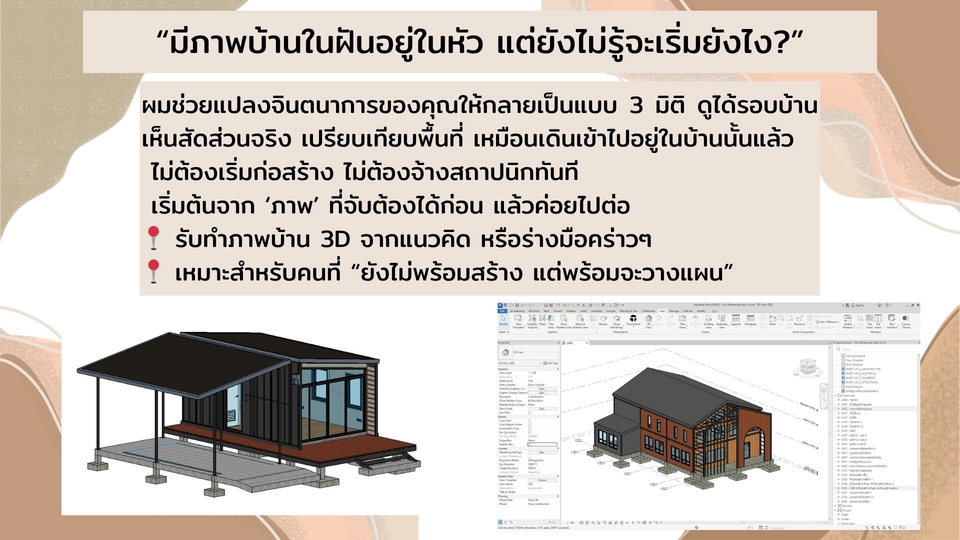 📍ระดับเริ่มต้น ผมช่วยแปลงจินตนาการของคุณให้กลายเป็นแบบ 3 มิติ ดูได้รอบบ้าน เห็นสัดส่วนจริง เปรียบเทียบพื้นที่ เหมือนเดินเข้าไปอยู่ในบ้านนั้นแล้ว ไม่ต้องเริ่มก่อสร้าง ไม่ต้องจ้างสถาปนิกทันที เริ่มต้นจาก ‘ภาพ’ ที่จับต้องได้ก่อน แล้วค่อยไปต่อ - รับทำภาพบ้าน 3D จากแนวคิด หรือร่างมือคร่าวๆ - เหมาะสำหรับคนที่ “ยังไม่พร้อมสร้าง แต่พร้อมจะวางแผน” 📍ระดับกลาง หลังจากคุณได้เห็นบ้านในฝันของตัวเองในแบบ 3 มิติแล้ว หากคุณพร้อมก้าวต่อไป ผมมีบริการ ✅ จัดทำแบบสถาปัตยกรรม ✅ จัดทำแบบโครงสร้าง ✅ เขียนแบบเพื่อยื่นขออนุญาตปลูกสร้างตามกฎหมาย โดยวิศวกรและทีมออกแบบที่มีใบประกอบวิชาชีพ