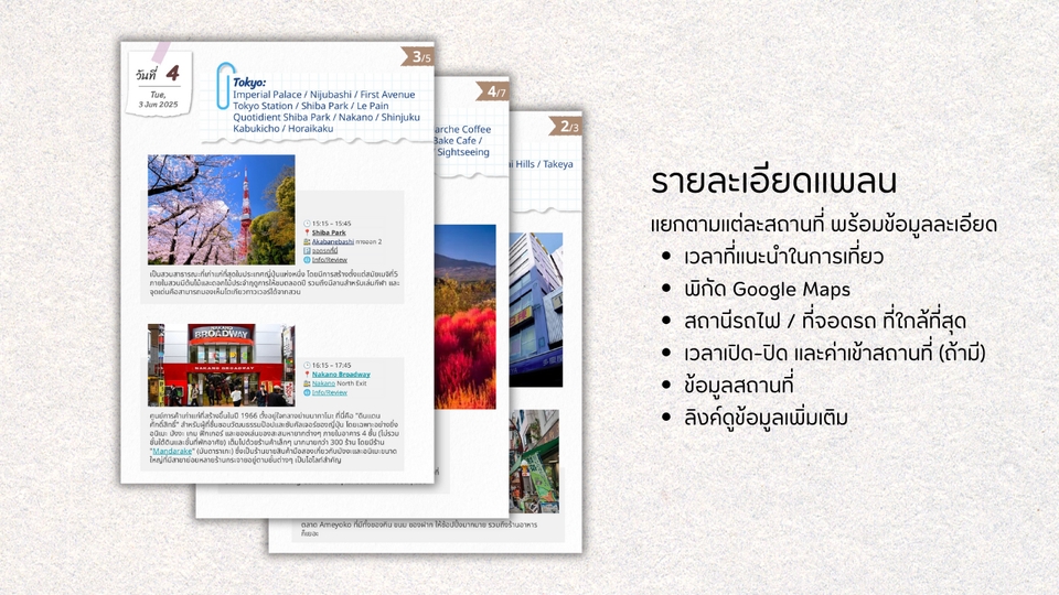 ฿1,500แผนการเดินทางอย่างละเอียด รูปแบบ PDF *เฉพาะเที่ยวในโตเกียว หรือโอซาก้า (1 เมือง) ไม่รวมเมืองอื่น ***นับจำนวนวันจากวันที่ลูกค้าเดินทางถึงประเทศญี่ปุ่น จนถึงวันที่เดินทางออกจากประเทศญี่ปุ่น