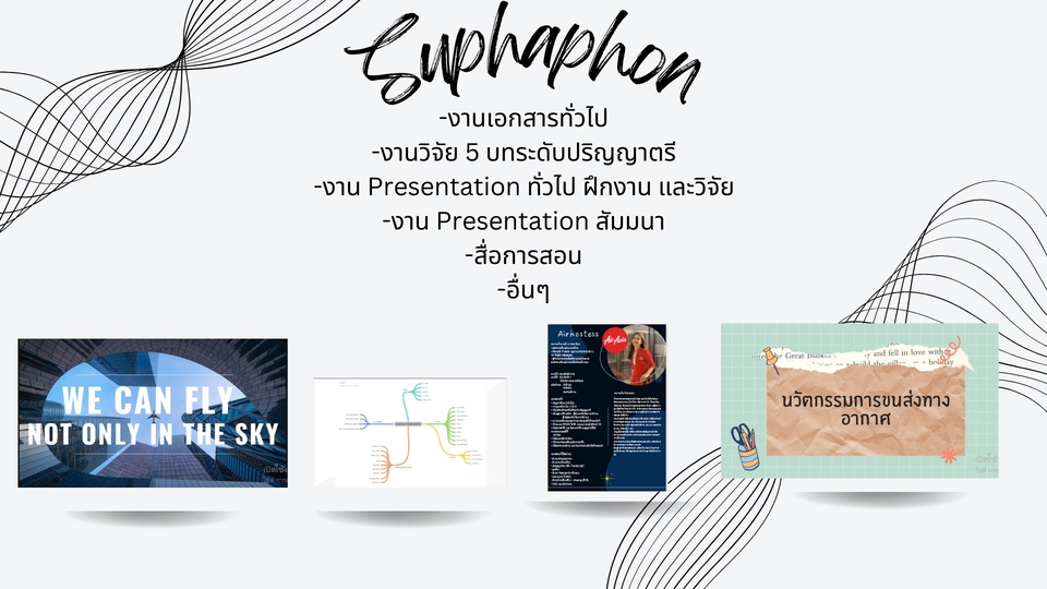 จบการศึกษาปริญญาตรี สาขาธุรกิจการบิน มีประสบการณ์การทำงานเอกสาร งาน Presentation การเขียน Mindmap มากกว่า 2 ปี มีประสบการณ์การทำวิจัยระดับปริญญา ปัจจุบันเป็นธุรการ ขั้นตอนการทำงาน 1. บรีฟงานจากลูกค้า ความต้องการ หัวข้อ สไตล์งาน สเกลงาน สโคฟงานและข้อมูล รูปแบบ Front รูปภาพประกอบ ห 2. ส่งให้ลูกค้าตรวจสอบ 3. ลูกค้าคอนเฟิร์ม จบงาน