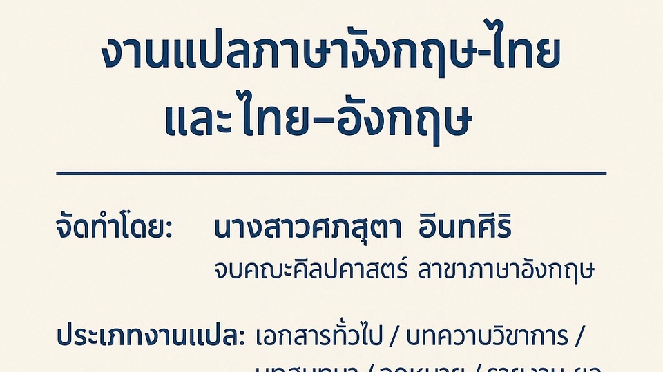 สวัสดีค่ะ ชื่อแนนนะคะ จบปริญญาตรี คณะศิลปศาสตร์ สาขาภาษาอักฤษ มหาวิทยาลัยพะเยา เคยทำงานแปลซับโฆษณาอังกฤษเป็นไทย,ไทยเป็นอังกฤษ รับแปลงานวิจัยของป.ตรี แปลเอกสารทั่วไป และช่วยตรวจสอบการแปลงานวิจัยของอาจารย์มหาวิทยาลัย