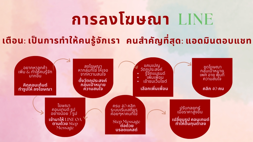฿5,0001.วางแผนการโฆษณาทาง LINE และกลยุทธ์ทางการตลาด 2.การสร้างคอนเทนต์ ตั้งแต่ ตัวเปิด ตัวตาม และตัวปิด การขาย 3.การตั้งค่าข้อความตอบกลับอัตโนมัติ ข้อความตอบกลับ การ์ดแมสเสจ ฯ 4.การทำรูปภาพ คลิป เพื่อทำการโฆษณา 5.การทำ Step Message เพื่อกระตุ้นความอยาก แล้วปิดการขายด้วยโปรโมชั่น 6.ผู้ว่าจ้าง ได้รับคนเพิ่มเพื่อนใน LINE OA มากขึ้น 7.สินค้าได้รับการรับรู้มากขึ้น จากปกติ