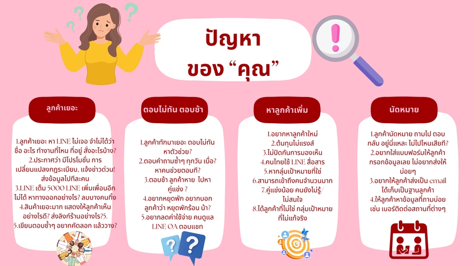 1.คอร์สออนไลน์ การสร้างคอร์สออนไลน์ครั้งแรก ตั้งแต่เริ่มต้น แนวคิด วางแผนการสอน การทำคลิป การเชื่อมระบบ นำผู้สนใจเข้ามาเรียน เป็นกลุ่มส่วนตัว 2.คอร์สออนไลน์ การสร้างรูปภาพ คลิปแบบสั้น ด้วย Canva 101 การทำรูปภาพแบบต่างๆ และคลิปสั้น 3.คอร์สออนไลน์ LINE OA เครื่องมือเก็บฐานลูกค้าและรักษาลูกค้าเก่า ทุกฟีเจอร์ที่จำเป็นและใช้บ่อย 4.คอร์สออนไลน์ LINE SHOPPING เป็น Market Place ที่มีลูกค้า 10 ล้านคนในแพลมฟอร์มนี้ 5.คอร์สออนไลน์ การทำโฆษณาทาง LINE อย่างไร การใช้กลยุทธ์ต่างๆ คอนเทนต์ตัวเปิด ตัวตาม 1 ตัวตาม 2 ปิดการขาย เริ่มสอนตั้งแต่แรกจนสามารถทำได้ด้วยตนเอง ขั้นตอนการทำงาน 1. ถาม ตอบ ความต้องการของลูกค้า ว่า สิ่งที่ต้องการตรงกับที่จะสอนหรือไม่ 2. เสนอสินค้าและบริการที่ตรงความต้องการของลูกค้า 3. เรียนแบบออนไลน์ หรือ แบบกลุ่ม หรือ แบบ 1 ต่อ 1 4. สามารถถาม - ตอบ 3 เดือน หลังจากที่สมัครเรียน แถม Zoom 1 ครั้ง 30 นาที 5. สอนแบบใช้คำพูดเข้าใจง่าย เปรียบเทียบต่างๆ ให้เห็นภาพ ทำให้เข้าใจยิ่งขึ้น 6. การเรียนควรทำเอง พัฒนาตนเองไปเรื่อยๆ แล้วเข้าใจ ทำบ่อยๆ เก่งขึ้นวันละนิดนะคะ