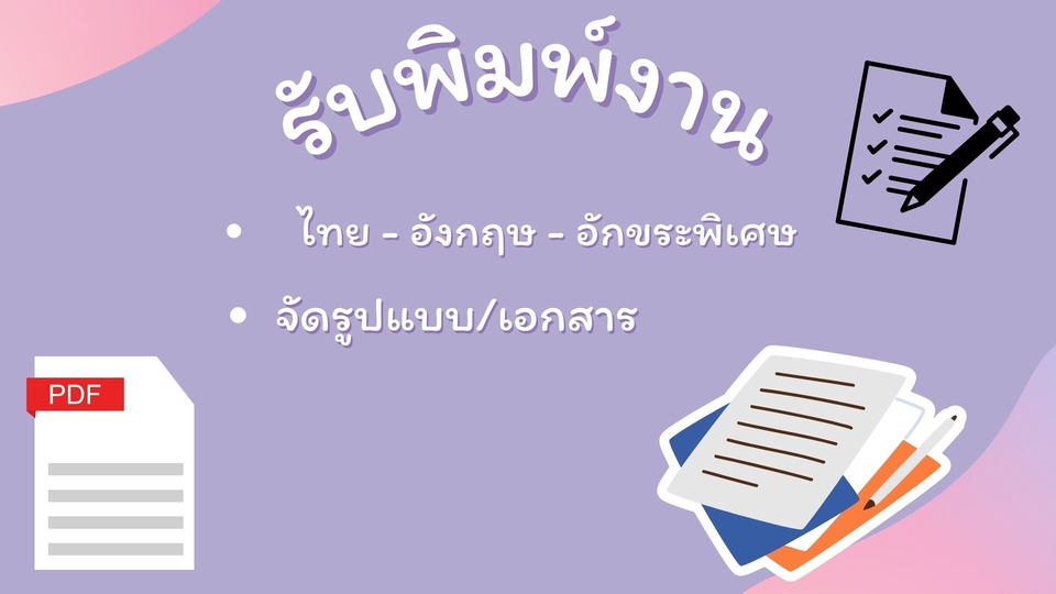 รับพิมพ์งาน จัดรูปแบบ - รับพิมพ์งาน/พิมพ์เอกสารตามต้นฉบับเช่น Word, PDF - สามารถพิมพ์สัญลักษณ์ อักขระพิเศษ โจทย์คณิตศาสตร์ ตารางได้ - รับพิมพ์งานจาก pdf - รับทั้งภาษาไทยและอังกฤษ - จัดรูปแบบรายงาน/เอกสาร - ส่งงานในรูปแบบ PDF, Word, excel ฯลฯ ขั้นตอนการทำงาน 1. 1. แจ้งรายละเอียดงานหรือตัวอย่างงานที่ต้องการให้ทำ, ระยะเวลาที่ต้องการ 2. 2. ตกลงราคา, ส่งใบเสนอราคา สามารถเจรจาต่อรองได้ 3. 3. เริ่มทำงานหลังยืนยันการจ้างงาน ส่งงานให้ตรวจทานแก้ไข สามารถแก้ไขงานได้ 2 ครั้ง 4. 4. ส่งมอบไฟล์งานต้นฉบับ และสามารถแปลงเป็น pdf ให้ได้