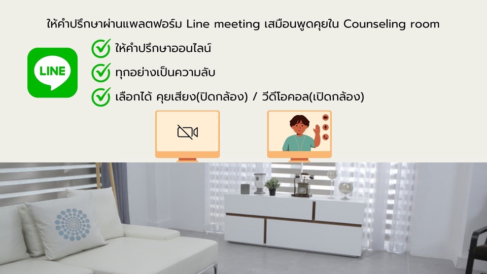 ร่วมกันหาทางออกของปัญหาผ่านกระบวนการรับฟังเชิงลึก(Deep Listening) ให้คำปรึกษาปัญหาการเลี้ยงลูก ปัญหาความสัมพันธ์ ความต่างระหว่างวัย โดยนักจิตวิทยาพัฒนาการ ทุกเรื่องที่คุยกันจะถูกเก็บรักษาเป็นความลับไม่มีการเปิดเผยตามหลักจรรยาบรรณวิชาชีพ อะไรที่สามารถคุยกันได้บ้าง - แนวทางการเลี้ยงลูกเชิงบวก การส่งเสริมพัฒนาการตามวัย - ความไม่เข้าใจกันของคนในบ้าน - ปัญหาความสัมพันธ์ - ปัญหาความรัก ความสัมพันธ์ทุกรูปแบบ - ปัญหาการเรียน การงาน - ปัญหาครอบครัว - ปัญหาการใช้สารเสพติด ไม่ว่าจะเครียดเรื่องอะไรก็สามารถมาพูดคุยหาทางออกร่วมกันได้ ขั้นตอนการทำงาน 1. ทักแชท สอบถามปัญหาเบื้องต้น 2. นัดหมายวัน-เวลา เพื่อรับบริการ 3. ชำระเงิน รับลิ้งค์ห้องให้คำปรึกษาออนไลน์