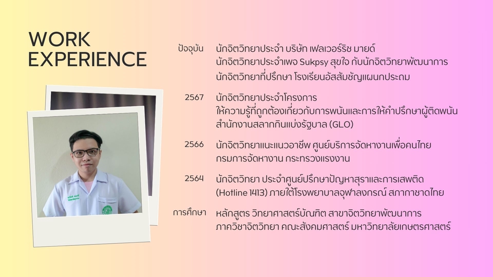 ปริญญาวิทยาศาสตรบัณฑิต จิตวิทยาพัฒนาการ มหาวิทยาลัยเกษตรศาสตร์ ประสบการณ์ในสายงานให้คำปรึกษารายบุคคล ปัจจุบันเป็นนักจิตวิทยาประจำบริษัท และเป็นที่ปรึกษาให้โรงเรียนเอกชน มีความสนใจพิเศษด้านจิตวิทยาเด็กและวัยรุ่น มุ่งเน้นการสร้างความเข้าใจอันดีให้กับครอบครัวที่มีความแตกต่างของแต่ละช่วงวัย