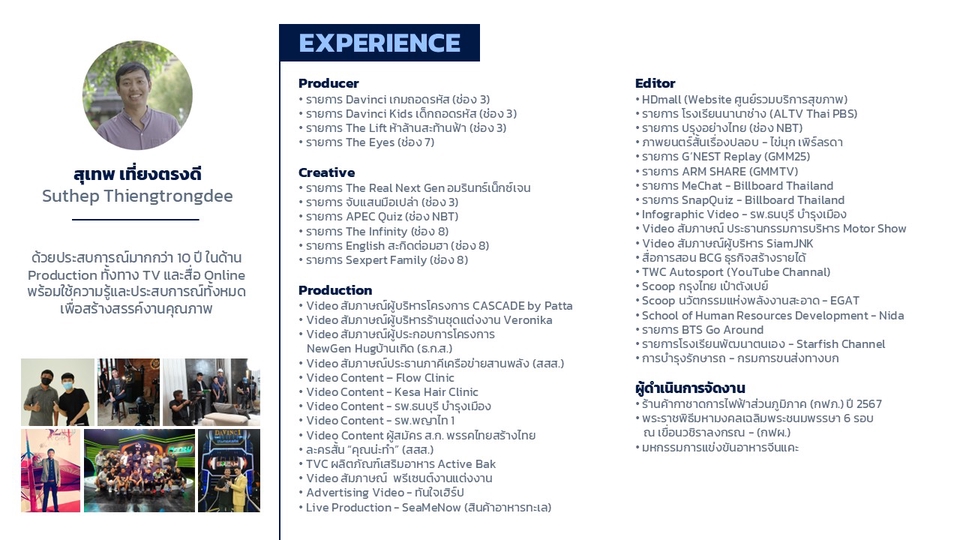 สุเทพ เที่ยงตรงดี ประสบการณ์มากกว่า 10 ปี ในด้าน Production ทั้งทาง TV และสื่อ Online | ดูแลลูกค้ามาแล้วทั้งภาครัฐและเอกชน มากกว่า 50 ราย | พร้อมใช้ความรู้และประสบการณ์ทั้งหมดเพื่อสร้างสรรค์งานคุณภาพ