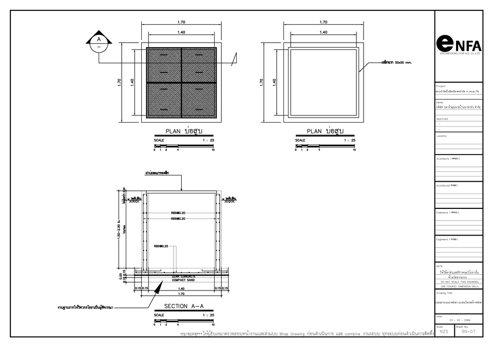 งานเขียนผังบริเวณก่อสร้าง Layoutของระบบบำบัด Sectionระบบบำบัด การเลือกขนาดของระบบให้เหมาะสมกับพื้นที่ การกำหนดบริเวณ รายะละเอียดค่าระดับต่างๆให้เหมาะสม ขั้นตอนการทำงาน 1. รับรายละเอียดและรายการคำนวณเบื้องต้นสำหรับออกแบบ 2. ส่งร่างเพื่ิอพิจารณาก่อนลงมือทำงานจริง